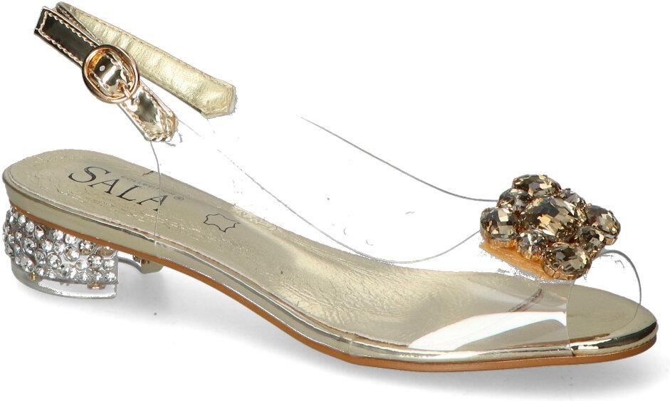 Eleganckie sandały renomowanej marki Sala:- wykonane zostały z wysokogatunkowego tworzywa sztucznego - wnętrze zostało pokryte miękkim tworzywem, które zapewnia maksymalny komfort podczas użytkowania - wkładka wewnętrzna wykonana została ze skóry naturalnej, co sprawia, że buty są nie tylko wygodne, ale również przyjazne dla skóry - delikatny obcas o wysokości 4 cm to idealne rozwiązanie dla tych, którzy szukają butów, które zapewnią odpowiednią stabilizację i pozwolą poczuć się elegancko - zapięcie na sprzączkę pozwala na swobodne regulowanie szerokości buta, co sprawia, że idealnie dopasuje się do stopy - przezroczysta cholewka to absolutny hit tego sezonu, który nadaje butom efekt szklanych butów. Jest to świetny wybór dla wszystkich, którzy cenią oryginalny styl i chcą wyróżnić się z tłumu. - złote dodatki i piękna ozdoba tworzą zachwycający efekt, który z pewnością przyciągnie uwagę - kolorystyka butów jest ponadczasowa i pasuje do wielu stylizacji, co czyni z nich doskonały wybór zarówno na co dzień, jak i na specjalne okazję