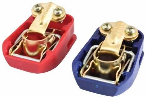 Klemy zaciskowe do akumulatora 800A. Uniwersalny zestaw klem samozaciskowych, stosowane w samochodach o biegunach tzw. standardowych wymiarów. Trwałe i odporne na korozję. Posiadają samozaciskową konstrukcję, dzięki czemu łatwo je zamontować i zapewniają szczelne połączenie. Zakres temperatur pracy: -40°C- +90 °C Parametry: Przepustowość: 1000 A Ciągłość przepływu: 430A Napięcie: 12-24V Biegunowość: Plus 19mm / Minus 17.5mm Przewód do Zamocowania: 4-6AWG