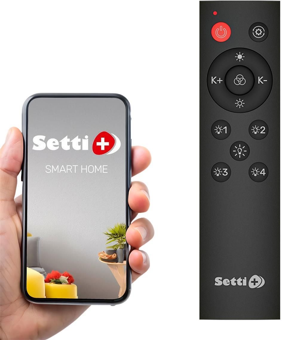 Pilot zdalnego sterowania marki SETTI+. Urządzenie pozwala na sterowanie inteligentnym oświetleniem SETTI+. Pilot współpracuje bezpośrednio z żarówkami - nie wymaga do działania dodatkowej aplikacji. Produkt oferuje następujące funkcje: regulacja jasności, ustawienia temperatury światła, łączenie żarówek w grupy (do 4 grup), zmiana scenerii w grupie. Do zasilania pilota potrzebne są dwie bateria AAA 1.5 V (brak w zestawie).