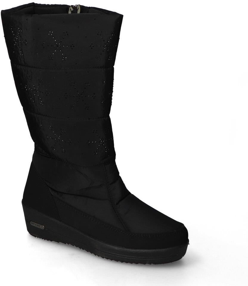 Wygodne śniegowce damskie: - cholewka wykonana została z materiału tekstylnego i tworzywa syntetycznego - ocieplane wnętrze aby zapewnić ciepło w chłodne dni - wkładka wewnętrzna wykonana z materiału ocieplającego - zamek błyskawiczny ułatwia szybkie zakładanie - podeszwa o grubości 5 cm zapewnia stabilizacje - klasyczny czarny kolor i modny fason tworzą świetne zestawienie, które zachwyci każdego!