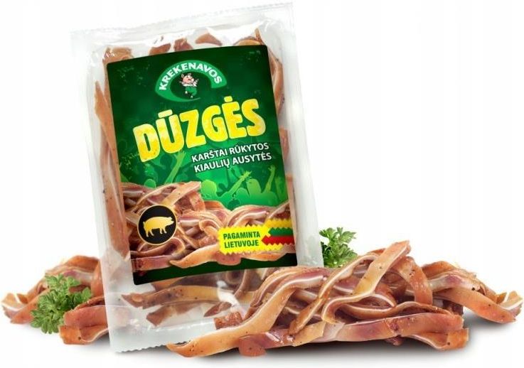 Uszy wieprzowe wędzone na gorąco 200g LITWA Uszy wieprzowe wędzone na gorąco 200g LITWA Na Litwie świńskie uszy to tradycyjny rarytas serwowany do piwa. Specjalnie przyrządzone i pokrojone w podłużne plastry uszy w smaku są słone i przypominają wędzonkę. Jednak ich największą zaletą jest niezwykła …