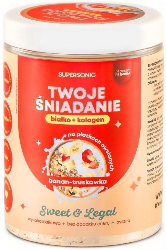 SUPERSONIC TWOJE ŚNIADANIE białko + kolagen o smaku banan-truskawka 420 g Najważniejsze właściwości: ⬅️ kompletny suplement śniadaniowy z białkiem i kolagenem idealne dla osób aktywnych fizycznie i nie tylko harmonijny smak banana z orzeźwiającymi nutami truskawek wzbogacony witaminami B zawiera błonnik SUPERSONIC TWOJE ŚNIADANIE białko + kolagen o smaku banan-truskawka 420 g to kompletny suplement śniadaniowy łączący wysokiej jakości białko z peptydami kolagenowymi, stworzony z myślą o zapewnieniu pełnowartościowego startu dnia. Produkt oferuje idealną kombinację składników odżywczych wspierających budowę masy mięśniowej, regenerację skóry oraz ogólną witalność organizmu w formie smakowitego shake'a o naturalnym smaku owoców. SUPERSONIC TWOJE ŚNIADANIE białko + kolagen o smaku banan-truskawka 420 g charakteryzuje się harmonijnym smakiem łączącym słodycz dojrzałego banana z orzeźwiającymi nutami soczystych truskawek, tworząc idealną kompozycję na poranny posiłek. Formuła została wzbogacona o witaminy z grupy B oraz błonnik. SUPERSONIC TWOJE ŚNIADANIE białko + kolagen o smaku banan-truskawka 420 g dostępny jest w wygodnym opakowaniu. Proszek łatwo rozpuszcza się w mleku, napojach roślinnych lub wodzie, tworząc kremowy, sycący napój idealny jako alternatywa dla tradycyjnego śniadania w zabieganym trybie życia. Składniki: Składnik - 100 g (%RWS) Wartość energetyczna - 400 kcal (20%) Tłuszcz - 6,7 g (10%) w tym nasycone kwasy tłuszczowe - 2,4 g (12%) Węglowodany - 44,9 g (17%) w tym cukry - 6,9 g (8%) Błonnik - 10,4 g (-) Białko - 34,7 g (69%) Sól - 0,53 g (9%) Hydrolizat kolagenu rybiego - 500 mg (-) Niacyna - 4 mg (25%) Cynk - 4 mg (25%) Selen - 13,75 μg (25%) Biotyna - 12,5 μg (25%) 56% płatki owsiane, 37,3% preparaty białkowe z mleka , substancje zagęszczające (karboksymetyloceluloza, guma guar, guma ksantanowa), aromaty, mieszanka funkcjonalna , truskawka suszona, emulgatory (lecytyny słonecznikowe), beta karoteny, sól himalajska, olej MCT, regulator kwasowości (kwas cytrynowy), substancja słodząca (sukraloza). Sposób użycia Do jednej porcji 60g (4-5 łyżek stołowych) dodaj 200ml gorącej/ciepłej wody. Wymieszaj dokładnie przez 1 minutę. Przeciwwskazania Produkt nie może być stosowany jako substytut zróżnicowanej diety. Zrównoważony sposób żywienia oraz zdrowy tryb życia są podstawą prawidłowego funkcjonowania organizmu. Nie należy przekraczać zalecanej porcji do spożycia w ciągu dnia. W przypadku stosowania leków lub innych suplementów diety należy skonsultować z lekarzem. Przechowywanie Przechowywać w temperaturze pokojowej. Chronić przed wilgocią. Przechowywać w sposób niedostępny dla małych dzieci. Podmiot odpowiedzialny: Supersonic Food PL Sp. z o.o. ul. Bruzdowa 100C / 2, 02-991 Warszawa NIP: 9512501164 SKU: 5905644489295