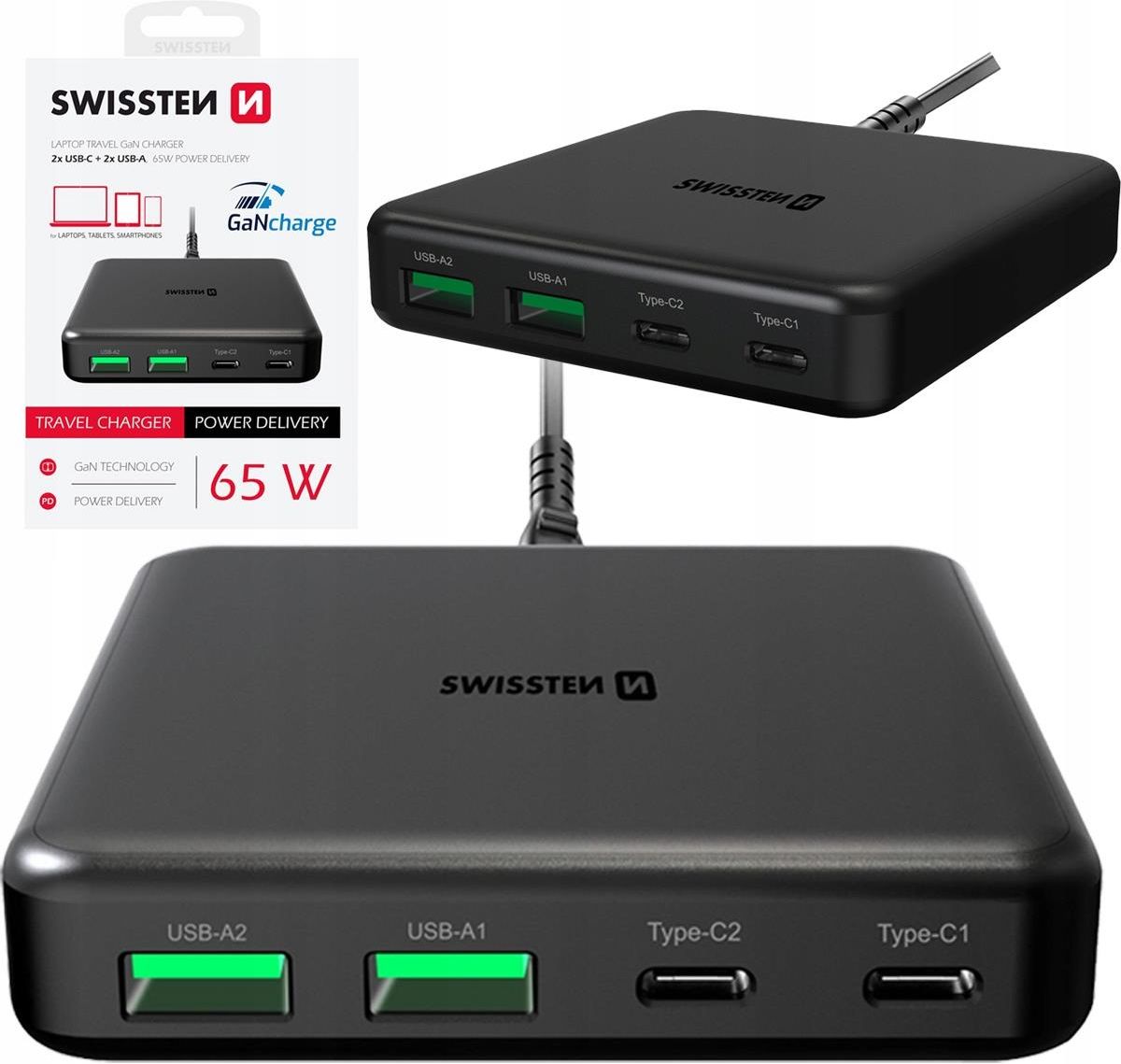 Ładowarka podróżna do laptopa tabletu smartfona Swissten 65W PD GaN Kompaktowa ładowarka wyjściami 2x USB-A i 2x USB-C oraz technologią szybkiego ładowania PowerDelivery i GaN Posiada wysoką moc wyjściową wynoszącą 65W z portu USB-C 1. Pozostałe porty ładują z maksymalną mocą 18W. przypadku …