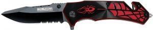 Nóż składany Tac Force TF-553BR Długość w stanie zamkniętym 114 mm Ostrze 82 mm ze stali nierdzewnej, grubość 3 mm, częściowo ząbkowane, wykończenie czarne Uchwyt aluminiowy Przecinak do pasów bezpieczeństwa Zbijak do szyb Kieszonkowy klips
