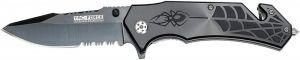 Nóż składany Tac Force TF-553GY Długość w stanie zamkniętym 114 mm Ostrze 82 mm ze stali nierdzewnej, grubość 3 mm, częściowo ząbkowane, wykończenie czarne Uchwyt aluminiowy Przecinak do pasów bezpieczeństwa Wybijak do szyb Kieszonkowy klips