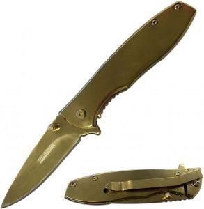 Nóż sprężynowy Długość w stanie zamkniętym 102 mm Ostrze 70 mm ze stali nierdzewnej, grubość 2,5 mm, wykończenie złote Uchwyt stalowy Kieszonkowy klips