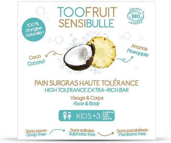 Kostka dermatologiczna, ANANAS I KOKOS, bardzo bogata formuła, do każdego rodzaju skóry, 85g, Toofruit Kostka dermatologiczna o wysokiej tolerancji (pH zbliżone do pH skóry dziecka), bez mydła do codziennej higieny dla dzieci. Jako substytut mydła, delikatnie oczyszcza twarz i ciało. Kostka czyści …