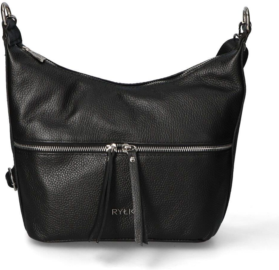 Torebka Ryłko : - wykonana ze skóry naturalnej licowej - wysokość 24 cm, szerokość 24 cm, szer. dna 13 cm - posiada odpinany, regulowany pasek o długości 135 cm - nie mieści A4 - model wyposażony w 2 kieszenie wewnętrzne, 2 kieszenie zewnętrzne - zapięcie na suwak - ozdobne elementy w kolorze srebrnym