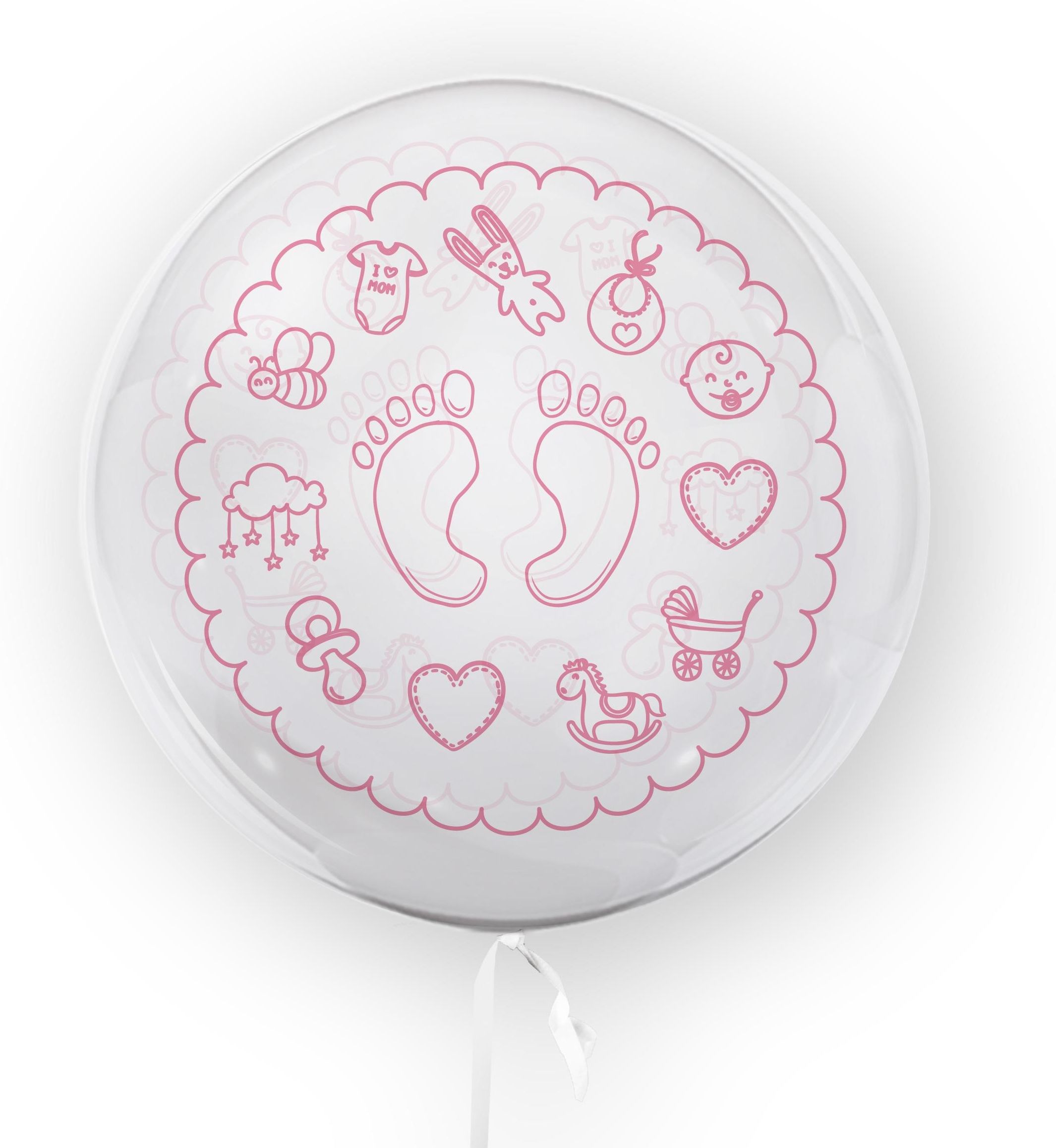 Balon z dziecięcą grafiką na Baby Shower. Doskonale nadaje się do udekorowania przyjęcia oraz jako upominek. Szczegóły produktu: są niezwykle mocne i wytrzymałe, mają kształt kuli, są przejrzyste i bardzo duże –po napompowaniu osiągają rozmiary do 60 cm, można napełniać je zarówno powietrzem, jak i helem, za pomocą wkładanych do środka elementów takich jak piórka, kolorowe styropianowe kuleczki, listki czy inne, mniejsze balony można aranżować je na wiele różnych sposobów, balony dostępne są zarówno w wersji transparentnej, jak i w wersji tematycznej na okazje typu baby shower czy urodziny. Instrukcja obsługi: Przygotuj balon. Rozciągnij balon we wszystkich kierunkach. Jeżeli masz długie paznokcie lub biżuterię zachowaj szczególną ostrożność, aby go nie przebić. Po rozciąganiu balon powinien być pomarszczony. Zacznij pompować balon. Do pompowania użyj ręcznej lub elektrycznej pompki do balonów, najlepiej o odpowiednio szerokiej dyszy. Kiedy balon jest już napompowany chwyć za końcówkę jego wlotu i zakręć ją ok. 20 razy, a następnie zawiąż. Możesz też użyć gumki albo sznurka w celu zawiązania balonu. Wskazówki:Balonu tego typu nie nadmuchasz ustami! Możesz natomiast napełnić balon helem, ręczną lub elektryczną pompką do balonów. Zwróć uwagę aby średnica dyszy była dopasowana do wlotu balonu. Podczas pompowania rób przerwy i nie pompuj balonu zbyt szybko – w szczególności jeżeli jest już duży i jego rozmiar zbliża się do tego który chcemy osiągnąć. W przeciwnym razie balon może pęknąć. W celu określenia wielkości balonu stosuj przeznaczone do tego miarki. Pompuj balon w temperaturze pokojowej. Pompowanie w zbyt niskiej temperaturze może spowodować pęknięcie balonu.