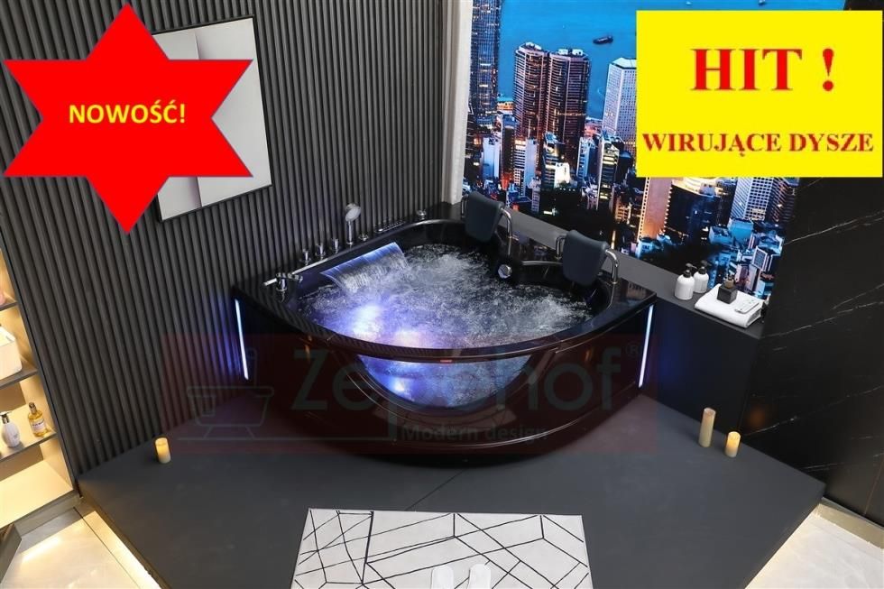 Wirujące dysze czarna Wanna z hydromasażem EG-015 narożna 150cmx150cmx65cm spadające SOPLE LEDowe HIT! Białystok