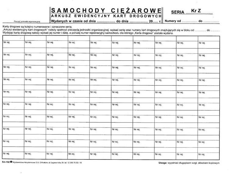 Wydawnictwa Rzemieślnicza Karta Drogowa Sm-102 Numerowana (Samochód Ciężarowy) A4 Białystok