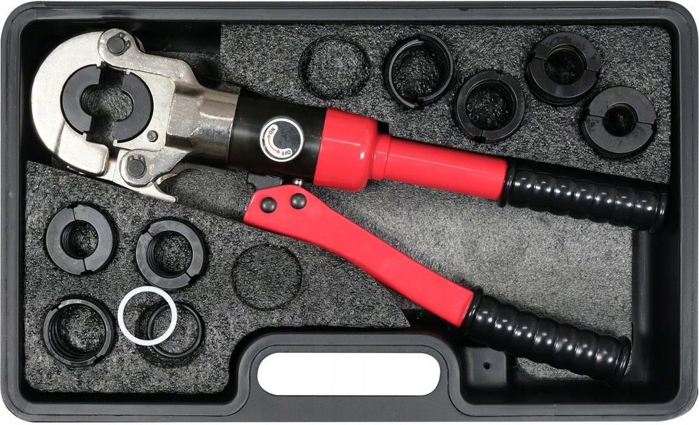 ZACISKARKA DO RUR PEX-AL-PEX PRASKA RĘCZNA 11 MATRYC TYP U/V/TH | 15/16/18/20/25/26/28/32mm Wysokiej jakości hydrauliczne narzędzie do zaciskania rur: Korpus wykonany jest z wysokiej jakości stali w procesie jednolitej obróbki cieplnej, wysoka wytrzymałość, niełatwy do złamania, długa żywotność. …
