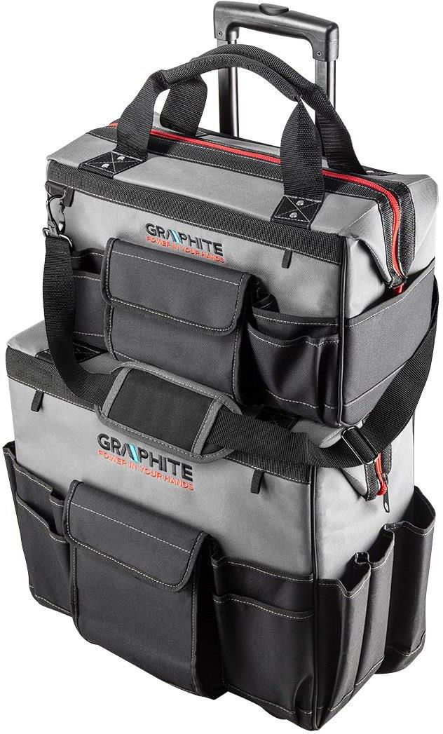 GRAPHITE 58G088 Zestaw dwóch toreb Energy+: duża torba na kółkach z rączką + średnia torba nadstawka Zestaw wytrzymałych toreb na elektronarzędzia GRAPHITE Energy+ na stelażu z teleskopową rączką i kołami zapewni mobilność w pracy. Duża pojemność toreb oznacza miejsce dla wielu elektronarzędzi, …