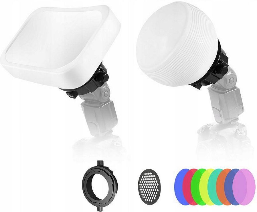 Uniwersalny Zestaw 2x Dyfuzor na lampę błyskową + Filtry Efektowe + Nasadka typu Plaster Miodu Produkt bardzo dobrej jakości Miękki silikonowy materiał dyfuzorów Specjalny adapter / pierścień z zestawu umożliwia łatwe dopasowanie do lampy oraz szybki montaż / demontaż dyfuzora Adapter posiada dodatkowo gwint montażowy z mocowaniem żeńskim 1/4" Uniwersalne zastosowanie, pozwalające na montaż dyfuzora w niemal każdej okrągłej lub kwadratowej lampie błyskowej W zestawie plaster miodu i 8 sztuk filtrów żelowych Dyfuzor pozwala na równomierne rozproszenie światła uzyskanego przy pomocy lampy błyskowej na całej fotografowanej powierzchni, sprawiając by było miękkie i naturalne. Dzięki dyfuzorowi na zdjęciach nie powstają cienie a oświetlenie całej ekspozycji jest równomierne.