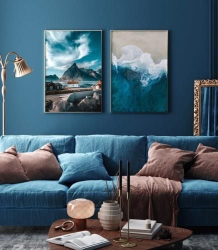 Kolekcja dwóch plakatów z przewagą błękitu, które przedstawiają niebo oraz ocean. Na grafice widzimy, od lewej:• plakat skłębione chmury w wym. 50x70 cm• plakat fale rozbijające się o plażę w wym. 50x70 cm Do plakatów nie są dołączone ramki.