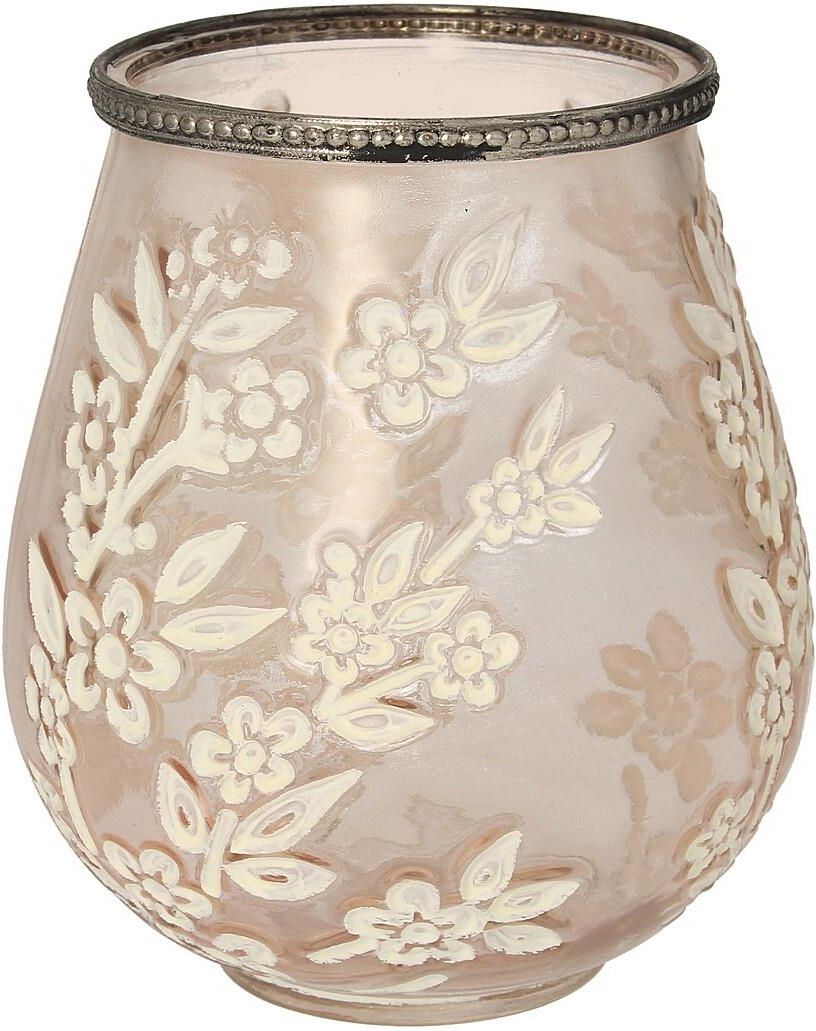 Szklany świecznik w kwiaty o delikatnym różowym odcieniu, ozdobiony eleganckim rantem. Ten urokliwy świecznik wykonany ze szkła przyciąga uwagę pięknymi, wypukłymi motywami kwiatów, które subtelnie zdobią jego powierzchnię. Różowy odcień szkła w połączeniu z delikatnym rantem nadaje mu wyjątkowego, romantycznego charakteru Idealny zarówno jako ozdoba stołu, jak i do stworzenia przytulnej atmosfery w dowolnym pomieszczeniu. Świetnie komponuje się z innymi świecznikami i dekoracjami, tworząc harmonijną aranżację. Wymiary: śr. 15 cm, wys. 18 cm.