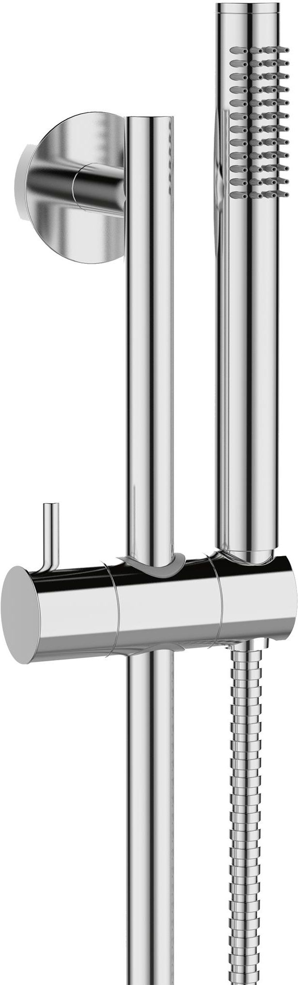 Zestaw natryskowy Alonia chrom Zestaw natryskowy na drążku ALONIA to praktyczne i stylowe rozwiązanie do każdej łazienki. Drążek o wysokości 60 cm pozwala na wygodne zamocowanie natrysku, a uchwyty montażowe z możliwością regulacji ułatwiają instalację. Ręczny natrysk o średnicy 2,5 cm, wykonany ze stali nierdzewnej, oferuje jeden rodzaj strumienia (normalny), a system anti-calc zapewnia długotrwałą bezawaryjność i łatwe utrzymanie w czystości. Dzięki uchwytowi suwakowemu z pokrętłem, możesz łatwo dostosować położenie słuchawki, co zwiększa komfort użytkowania. Całość dopełnia stalowy wąż natryskowy o długości 150 cm, wykonany w podwójnym splocie, co gwarantuje jego trwałość i estetyczny wygląd. SPECYFIKACJA Drążek natryskowy, wysokość 60 cm Natrysk ręczny 1-funkcyjny (strumień normalny) O 2,5 cm, ze stali nierdzewnej, z systemem anti-calc Uchwyt suwakowy regulowany pokrętłem - zapewnia wygodę użytkowania Uchwyty montażowe nieregulowane Wąż natryskowy stalowy o podwójnym splocie, długość 150 cm