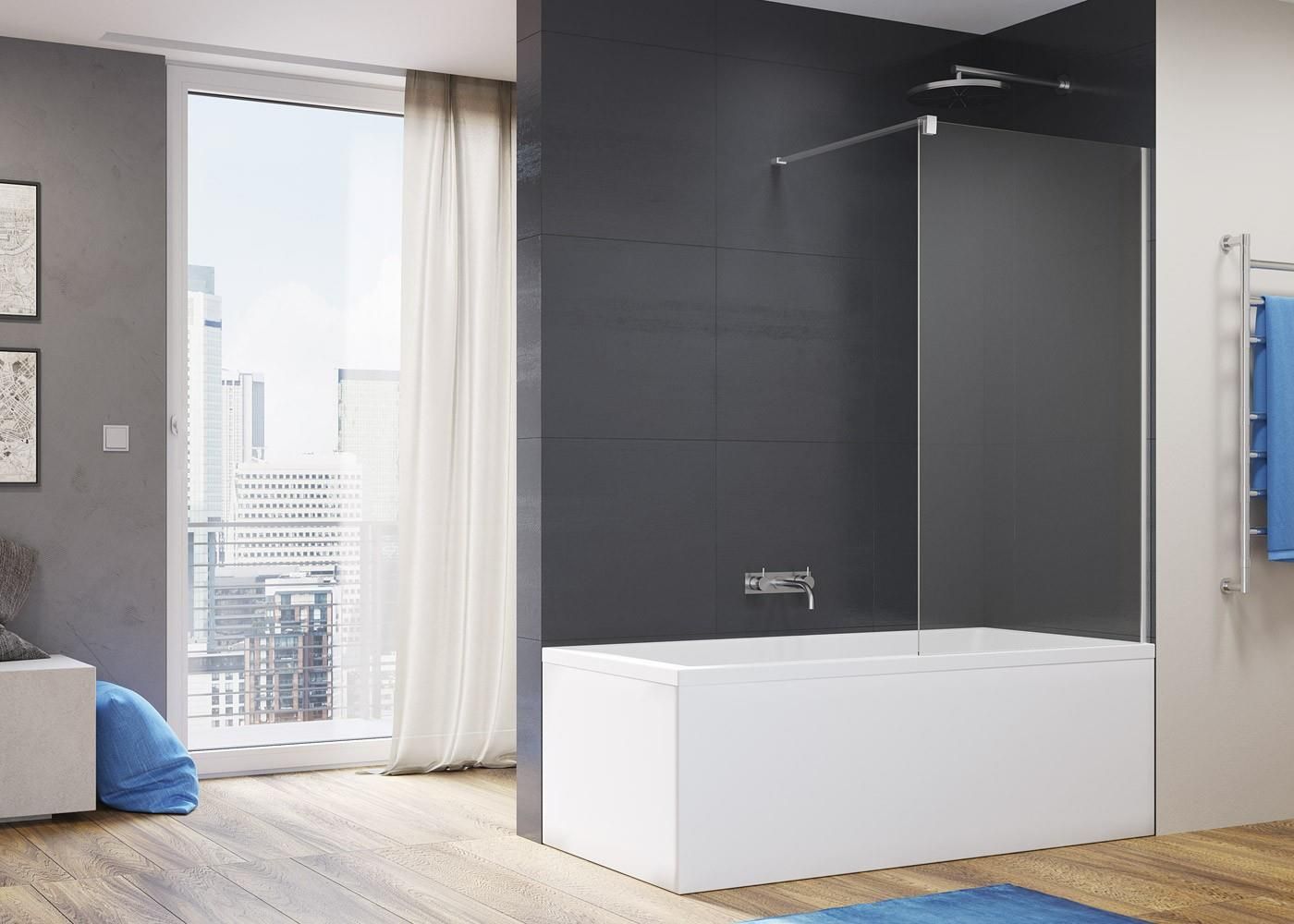 Parawan nawannowy EASY STR4P6B 120 mocowany na stae Renomowanej szwajcarskiej firmy SanSwiss uniwersalny monta jako lewy/prawy nr kat STR4P6B1205007 Wykoczenie srebrny poysk Przycienny profil zawiasowy czarny mat Szeroko 1188 - 1205 mm Wysoko 150 cm Szko : Przeroczyste hartowane 6mm Szko z wypalan z powok przeciwosadow AQUAPERLE Wspornik narony w komplecie
