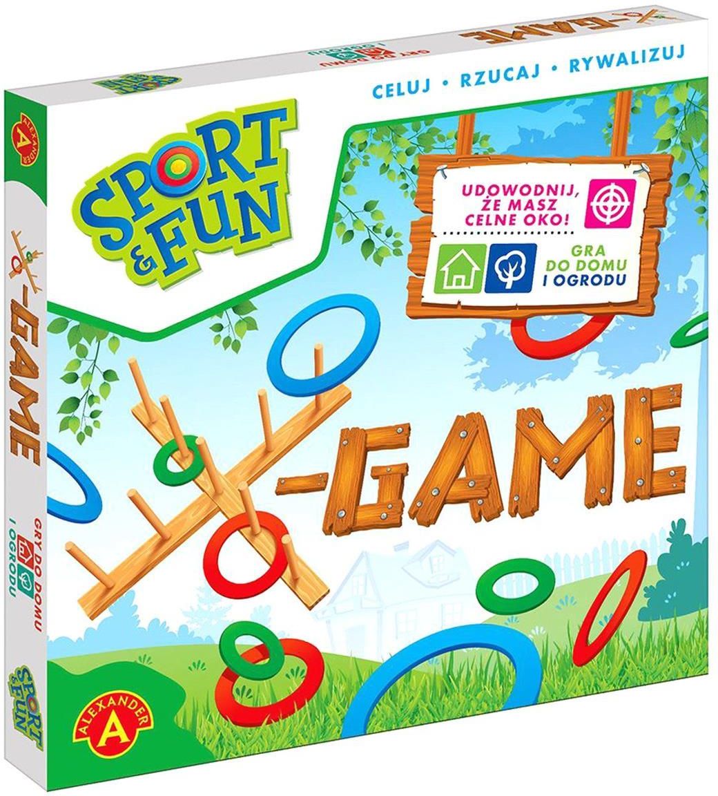 X Game Gra w której sprawdzisz swoją celność i wzmocnisz sprawność fizyczną. Oparta została o drewniany stojak w kształcie krzyża, do którego rzucamy obręczami o 3 różnych średnicach. Ilość zdobytych punktów zależy zarówno od rozmiaru rzucanej obręczy, jak i od miejsca na stojaku, w które trafimy. Aż 6 wariantów gry, w których nie tylko musimy celnie rzucać, ale także szybko biegać oraz wykazać się kondycją przy wykonywaniu skłonów, pajacyków i przysiadów. Jak każda z gier SPORT&FUN dostarcza nie tylko wspaniałej rodziny w gronie przyjaciół i rodziny, ale także wzmacnia naszą kondycję fizyczną i pomaga w tworzeniu zdrowych nawyków. Wspaniała zabawa na zewnątrz i do domu. Zawartość opakowania  stojak- 11 elementów, obręcze do rzutów- 2 komplety, tablica suchościeralna 1szt, mazak 1 szt., sznurek 1 szt., klepsydra 1 szt., instrukcja