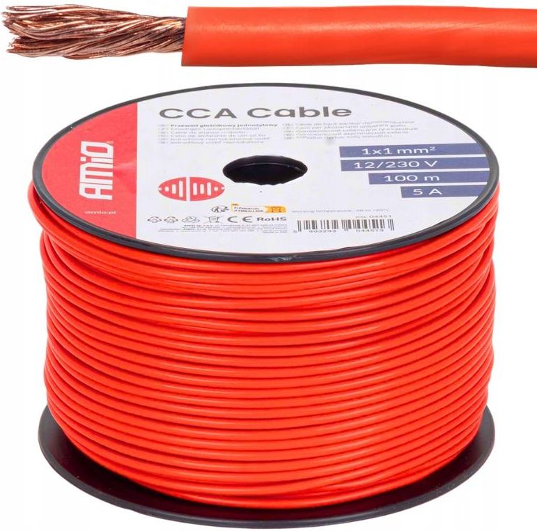 KABEL PRZEWÓD JEDNOŻYŁOWY RED CCA 1x1M2 5A LINKA 100M 1MM ELEKTRYCZNY Przewód instalacyjny CCA 1 mm² – lekki, elastyczny i gotowy do działania! Idealny do prostych instalacji 12V i 230V, gdzie liczy się kompaktowa średnica, wygodna izolacja i niezawodne przewodzenie. Przekrój 1x1 mm² umożliwia bezpieczną pracę przy prądzie do 5 A ✅ Jednożyłowa konstrukcja – szybki i prosty montaż ✅ Elastyczna izolacja – łatwe prowadzenie przewodu ✅ Długość 100 metrów – praktyczna rolka na wiele zastosowań ✅ Technologia CCA – korzystny stosunek ceny do funkcjonalności ✅ Czerwona izolacja – łatwa identyfikacja w wiązce Doskonały do oświetlenia LED, instalacji niskonapięciowych, projektów warsztatowych i hobbystycznych. Indeks: ARTA1356 Producent: AMiO Co cechuje nasz produkt? Wysoka jakość wykonania oraz niska cena wyróżnia nas na tle konkurencji. Możesz być pewny, że otrzymasz towar w pełni wartościowy. Specyfikacja techniczna ✔️ Typ przewodu: jednożyłowy ✔️ Kolor izolacji: Czerwony ✔️ Materiał żyły: CCA (aluminium pokryte miedzią) ✔️ Przekrój: 1 x 1 mm² ✔️ Długość rolki: 100 m ✔️ Napięcie pracy: 12 V / 230 V ✔️ Maksymalny prąd: 5 A ✔️ Izolacja: elastyczna, odporna na zginanie i uszkodzenia Zalety produktu ✅ Uniwersalne zastosowanie w instalacjach 12 V i 230 V o niewielkim poborze mocy ✅ Stabilne parametry pracy przy lekkim obciążeniu ✅ Żółty kolor izolacji ułatwia szybką identyfikację przewodu w instalacji ✅ Elastyczna i trwała izolacja ułatwia montaż w trudno dostępnych miejscach ✅ Rolka 100 m – praktyczna długość do mniejszych i średnich projektów
