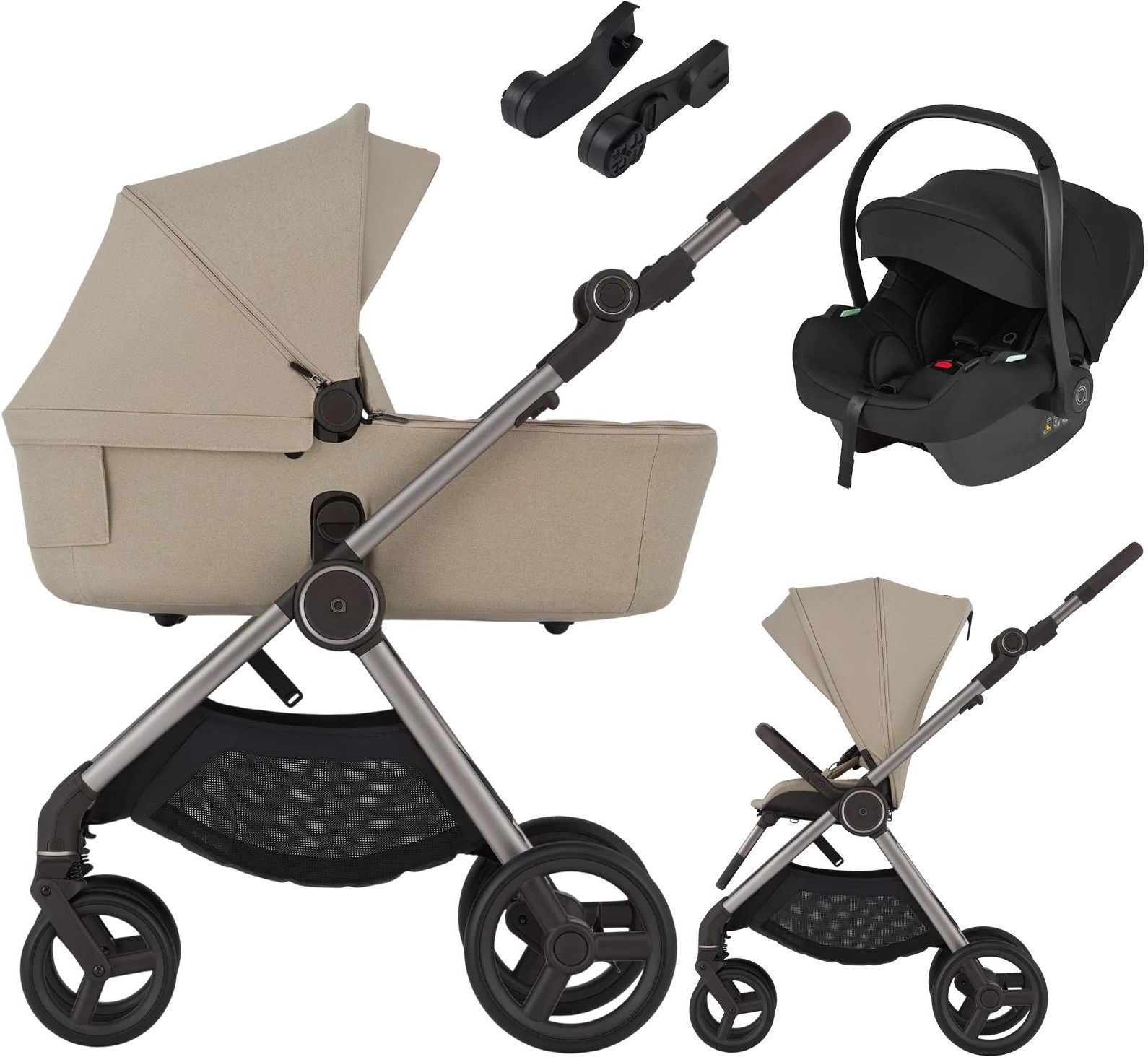 Anex IQ - wózek głęboko-spacerowy 3w1 z fotelikiem Anex Cosmo +GRATIS adaptery do fotelika Wózek Anex IQ 2w1 to inteligentne rozwiązanie, który łączy w sobie funkcje wózka głębokiego, spacerowego z przekładanym siedziskiem oraz ultrakompaktowej spacerówki mieszczącej się w luku bagażu podręcznego samolotu. Kupujesz jeden wózek, a zyskujesz aż 6 w jednym! Jak to możliwe? Przekonaj się poznając wszystkie cechy Anex IQ. Gwarantujemy 100% zaskoczenie. Wyobraź sobie uniwersalny wózek – idealny zarówno na trudny teren, jak i na zakupy, który dostosowuje się do każdej sytuacji. Miejski, ale gotowy na przygody w naturze, z dodatkiem ultrakompaktowej spacerówki, którą łatwo zmieścisz w samolotowym bagażu. To właśnie wózek Anex IQ 2w1 - wyjątkowy, niepowtarzalny produkt, który niczym kameleon przekształca się w taki wózek, jaki potrzebujecie: - wózek z gondolą z większymi kołami lub mniejszymi kołami, - uniwersalny wózek spacerowy z przekładanym siedziskiem na większych lub mniejszych kołach, - ultrakompaktowa spacerówka Buggy na większych lub mniejszych kołach. Wózek 6w1 Anex IQ oferuje Łącznie aż 6 kombinacji. Gondola, terenowy wózek spacerowy i mała, zwinna spacerówka Buggy w jednym. Mieszajcie i łączcie różne części IQ według swoich aktualnych potrzeb - prawdopodobnie nigdy nie zechcecie kupić innego wózka. Budka XXL Poszerzana budka XL zapewni Twojemu dziecku maksymalną ochronę przed słońcem, wiatrem i deszczem. Możesz bez obaw korzystać ze wspólnych spacerów, mając pewność, że maluch jest zawsze odpowiednio zabezpieczony. Inteligentna amortyzacja Co powiesz na innowacyjną amortyzację? Dzięki niej zawieszenie jest wyczuwalne w każdej wersji - również w wersji "samolotowej". To zapewni Wam swobodę i wygodę w każdych warunkach. Nie musisz się ograniczać podczas wspólnych spacerów i podróży. Doskonała wentylacja Wózek Anex IQ 2w1 oferuje świetną wentylację dzięki umieszczonemu w budce panelowi wentylacyjnemu oraz możliwości odsłonięcia panoramicznego okna, co gwarantuje dziecku stały dostęp do świeżego powietrza i przyjemne warunki nawet podczas ciepłych dni. Fotelik samochodowy Anex Cosmo 2.0 (40-85 cm) Fotelik samochodowy Anex Cosmo 2.0 by Avionaut charakteryzuje się niską wagą (3,2 kg), a także doskonałymi wynikami w testach zderzeniowych, co łączy w sobie wygodne użytkowanie z najwyższym bezpieczeństwem przez pierwsze miesiące życia. Dodatkowa wkładka oraz miękka tapicerka zapewniają dziecku prawidłowe ułożenie i maksymalny komfort. Fotelik można łatwo zamocować na ramie wózka, a także w samochodzie za pomocą pasów samochodowych lub na jednej z dostępnych baz ISOFIX (do zakupienia osobno), zapewniając optymalne bezpieczeństwo. Wzrost dziecka: 40-85 cm Sposób montażu: pas samochodowy/baza ISOFIX Norma i-Size: tak Testy ADAC (bezpieczeństwo): Przekładane siedzisko Wózek ten został zaprojektowany z myślą o wszechstronnej wygodzie Twojego dziecka, oferując przekładane siedzisko, regulowane oparcie i podnóżek, co pozwala na dostosowanie pozycji maluszka do snu lub obserwacji otoczenia, dbając o jego komfort i bezpieczeństwo na każdym kroku. Szeroka budka Wózek charakteryzuje się szeroką budką w siedzisku spacerowym, rozciągającą się dla zapewnienia pełnej ochrony. Ta budka tworzy przestronną, zacienioną przestrzeń, zwiększając komfort podróżującego dziecka. Wentylacja oparcia Ukryta wentylacja w oparciu siedziska gwarantuje nie tylko ciągły dopływ świeżego powietrza, ale także utrzymuje optymalną temperaturę podczas spacerów. To dyskretne rozwiązanie gwarantuje komfort malucha w każdych warunkach. Spacerówka Buggy Spacerówka Buggy oferuje pełną regulację, umożliwiając dostosowanie zarówno oparcia, jak i podnóżka do indywidualnych potrzeb dziecka, zapewniając mu optymalną pozycję siedzącą lub leżącą. Wygodnie na co dzień, jak i w podróży. Wentylacja Buggy System wentylacyjny w budce Buggy gwarantuje odpowiednią cyrkulację powietrza, co znacząco poprawia komfort użytkowania przez zmniejszenie nagromadzenia ciepła i wilgoci. Efektywna wentylacja przyczynia się do przyjemniejszych warunków podróżowania, niezależnie od pogody. Wyjątkowo kompaktowy Prosty system składania wózka do malutkich rozmiarów umożliwia łatwe przechowywanie i transport, sprawiając, że jest on idealnym rozwiązaniem dla rodzin ceniących mobilność i oszczędność miejsca. Możliwość złożenia gondoli "w pół" oraz opcja składania spacerówek razem ze stelażem to dodatkowe, mocne atuty. Adaptery podwyższające Adaptery podwyższające gondolę pozwalają na regulację wysokości. Ta funkcjonalność nie tylko ułatwia opiekę i interakcję z dzieckiem, ale także poprawia ergonomię użytkowania wózka, dostosowując go do indywidualnych preferencji rodziców. Zestaw do zadań specjalnych W zestawie z wózkiem znajdziesz dwa zestawy kół (mniejsze i większe), dwie rączki o różnych szerokościach, osłonę przeciwdeszczową do gondoli i siedziska, oraz dwie barierki bezpieczeństwa. Wózek Anex e/type polecamy rodzicom, dla których ważne są m.in.: - najwyższa jakość wykonania z dbałością o każdy detal - uniwersalność wózka, by radził sobie w każdym terenie - łatwa obsługa i przyjemność użytkowania - przestronna gondola z poszerzaną budką - przekładane siedzisko spacerowe Pozostałe cechy wózka Anex IQ: - rama wózka z możliwością regulacji szerokości, - automatyczna blokada przed rozłożeniem, - bezdętkowe koła, - 2 zestawy kół (większe: terenowe + mniejsze: miejskie), - przednie koła z blokadą do jazdy prosto, - dodatkowa amortyzacja w mechanizmie składania, - wygodny w użyciu hamulec bezpieczeństwa, - regulowana rączka w dwóch pozycjach, - tkaniny z wodoodpornym wykończeniem, - filtry przeciwsłoneczne UV 50+, - zdejmowany pałąk, - 5-pkt pasy bezpiecze