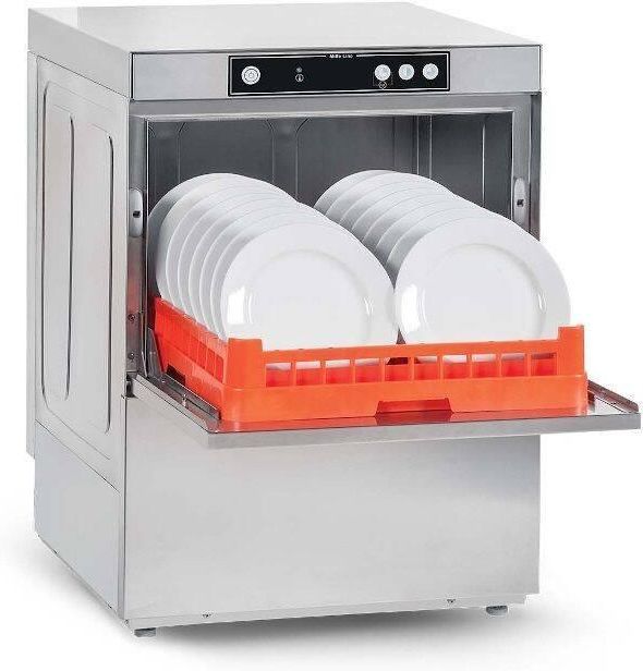Zmywarka gastronomiczna do naczyń Mitte Line z wbudowaną pompą spustową. Wbudowany dozownik płynu nabłyszczającego i myjącego. Zawór zwrotny, który zapobiega cofaniu się wody. Dolne i górne ramiona myjące i płuczące. Wydajność orientacyjna do 30 koszy na godzinę. Termostat bezpieczeństwa, który pozwala na kontrolę temperatury mycia 60ºC oraz wyparzania 85ºC. Łagodny start. Sterowanie cyfrowe. Cykl mycia wynosi 90/120/180 s. W wyposażeniu 1 kosz CP-16/18, 1 kosz CT-10 i 1 pojemnik na sztućce CU-7. Uwaga: Towar na zamówienie. Termin realizacji ustalany przy składaniu zamówienia. Mycie w zmywarce gastronomicznej może się odbywać wyłącznie przy użyciu profesjonalnych środków chemicznych przeznaczonych do zmywarek przemysłowych. Zmywarka powinna mieć zamontowany uzdatniacz wody.