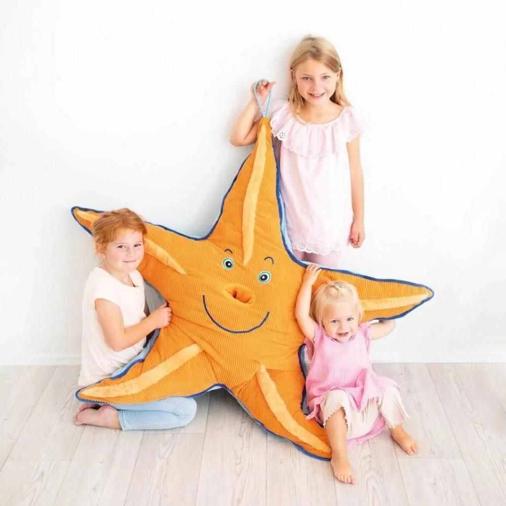 Mr. Bubbles – rozgwiazda do nauki recyklingu Mr. Bubbles to wyjątkowa rozgwiazda edukacyjna, która zapewnia zabawę, a przy tym wprowadza dzieci w temat ochrony środowiska. Dzięki niej najmłodsi uczą się, jak ogromne znaczenie ma dbanie o czystość oceanów. Przedszkolaki oswajają się z tematem recyklingu poprzez usuwanie odpadów z brzucha rozgwiazdy (czyli dołączonych do zestawu elementów obrazujących śmieci) i pozostawianie w nim jedynie zdrowych rzeczy do jedzenia (ślimaki, kraby i inne składowe pożywienia rozgwiazdy). Jest to doskonałe narzędzie edukacyjne, które w sposób przystępny i angażujący dla dzieci porusza kwestie ekologii. Wykonana z wysokiej jakości, przytulnych materiałów, rozgwiazda Mr. Bubbles jest idealnym kompanem do zabawy dla dzieci w wieku od 2 lat wzwyż. Dzięki praktycznej pętli do zawieszenia może być łatwo przechowywana lub używana w różnych miejscach, takich jak dom, przedszkole czy szkoła. Zabawka przeznaczona jest do wspólnej zabawy dla maksymalnie czterech dzieci, co sprzyja integracji i współpracy. Mr. Bubbles jest narzędziem, które rozwija zdolności sensoryczne, logiczne oraz językowe. Dzieci dowiadują się, co jedzą rozgwiazdy i jak mogą przeciwdziałać zanieczyszczeniu oceanów. Jest to także doskonała zabawka do tulenia i idealny element zajęć w przedszkolu. [ikony-produktu-opisy] Co zawiera? Zestaw łącznie zawiera 20 elementów: miękką rozgwiazdę elementy ze sklejki bukowej przedstawiające śmieci i pożywienie rozgwiazdy (np. kraby, ślimaki) 4 karty obrazujące śmieci, które trzeba wyciągnąć z rozgwiazdy. Główne informacje Średnica: 130 cm Rozmiar opakowania: 50 × 50 × 30 cm Materiał: Elementy przedstawiające śmieci i składniki „jadłospisu” rozgwiazdy: sklejka bukowa Zabawka: sztruks, sztuczne futro, bawełna, terylen, drut Wiek: +2 Liczba elementów: 20 Liczba graczy: 1-4 Waga: 2,3 kg Pomysły na zabawę „Oczyść Ocean z Mr. Bubbles” – doskonalenie motoryki małej, nauka sortowania, rozwijanie koordynacji oko-ręka, rozwijanie umiejętności sensorycznych, rozwijanie współpracy, nauka o ekologii Zasady gry: Wszyscy gracze wspólnie napełniają brzuch Mr. Bubbles dołączonymi do zestawu elementami obrazującymi śmieci i zdrowe jedzenie rozgwiazdy. Otwór do wypełnienia znajduje się na dole rozgwiazdy. Każdy gracz otrzymuje planszę będącą w zabawie koszem na śmieci. W przypadku dwóch graczy każdy z nich używa po dwie plansze. Jeśli gra trzech graczy, pozostawiona czwarta plansza może być wypełniona przez wszystkich. Dzieci na zmianę sięgają do brzucha Mr. Bubbles i losowo wyciągają przedmioty. Zadaniem każdego gracza jest rozpoznanie, czy przedmiot to śmieć czy jedzenie dla Mr. Bubbles. Śmieci trafiają na karty będące koszem na śmieci, a jedzenie wraca do brzucha rozgwiazdy. Gracz, który jako pierwszy napełni swój kosz na śmieci odpowiednimi elementami, wygrywa. „Rybki i śmieci” – doskonalenie motoryki małej, nauka sortowania, rozwijanie koordynacji oko-ręka Przedszkolaki sortują elementy dołączone do zestawu, po jednej stronie układając śmieci, a po drugiej – elementy pożywienia dla rozgwiazdy. Ta zabawa rozwija zdolności manualne i logiczne myślenie.