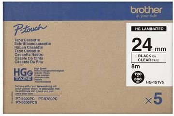 Brother  HGe-151V5 24mm szerokości, 8m długości Stworzone dla branż wymagających wydruku dużej ilości etykiet Opakowanie zbiorcze zawiera 5 taśm Wysokiej jakości oryginalne taśmy firmy Brother Zapewnia wyraźne rezultaty Opis produktu  Brother HGe-151V5 Wysokiej klasy taśmy HGe-151V5 oferują zarówno profesjonalne wydruki jak i wysoką prędkość druku. Stanowią idealne narzędzie dla branż, które wymagają wydruku dużej ilości etykiet w krótkim czasie. Więcej informacji o produkcie  Brother HGe-151V5 Taśma HGe-151V5 wyróżnia się takimi cechami jak standardowe laminowane taśmy TZe. Ta czarna taśma na przezroczystym tle została poddana rygorystycznym taśmom w zakresie trwałości i niezawodności. Nośnik HGe-151V5 charakteryzuje się zarówno wysoką rozdzielczością jak i wysoką prędkością druku.Stanowi idealne rozwiązanie dla branż, które wymagają wydruku dużej ilości etykiet w krótkim czasie. Te laminowane taśmy samoprzylepne są odporne na wysokie temperatury, chemikalia, ścieranie oraz wodę. Tym samym mogą być stosowane zarówno wewnątrz jak i na zewnątrz. Wybierając taśmę HGe-151V5, możesz mieć pewność, że Twoja drukarka etykiet będzie drukować sprawnie, tworząc jasne, czytelne i trwałe etykiety.
