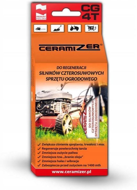 Ceramizer do sprzetu ogrodniczego (CG-4T) kosiarki , traktorki Ceramizer CG-4T - do regeneracji i zabezpieczania silnika czterosuwowego sprzętu ogrodowego Preparat do regeneracji i zabezpieczania przed zużyciem powierzchni tarcia silnika czterosuwowego sprzętu ogrodowego. Regeneracja silnika odbywa się bez demontażu mechanizmu, podczas codziennego użytkowania. Jej pierwszym etapem jest zaaplikowanie dodatku do oleju silnikowego. Następnie rozpoczyna się proces tworzenia ochronnej powłoki ceramiczno-metalowej. Dodatkowa warstwa narasta w miejscach poddawanych siłom tarcia, ze szczególnym uwzględnieniem najbardziej zużytych powierzchni. Ochronna warstwa wyrównuje wszelkie mikrouszkodzenia, zarysowania i deformacje powierzchni części silnika. Jej narastanie odbywa się w ciągu około 30 godzin pracy mechanizmu. Wspomniana warstwa zachowuje swoje właściwości podczas minimum 1400 godzin pracy. Ceramizer CG-4T zabezpiecza powierzchnie silnika przed korozją. Jest to szczególnie istotne zwłaszcza podczas zimowania sprzętu. Opakowanie : 4ml Preparat Ceramizer CG-4T może być stosowany w urządzeniach i maszynach wyposażonych w silnik czterosuwowy, takich jak: kosiarki spalinowe, kosiarki spalinowe samobieżne, odśnieżarki, piły spalinowe, kosy spalinowe, agregaty prądotwórcze. Sposób użycia : Ilość oleju w silniku w litrach: do 2L : 2-5L : 5-8L Przy przebiegu 20-100 mth (1-5 tys. km) 0,5 dozy : 1 doza : 2 dozy Przy przebiegu 100-300 mth (5-15 tys. km) 1 doza : 2 dozy : 3 dozy Przy przebiegu: 300-600 mth (15-30 tys. km) 2 dozy : 3 dozy : 4 dozy Przy przebiegu: powyżej 600 mth (30 tys. km) 3 dozy : 4 dozy : 5 doz
