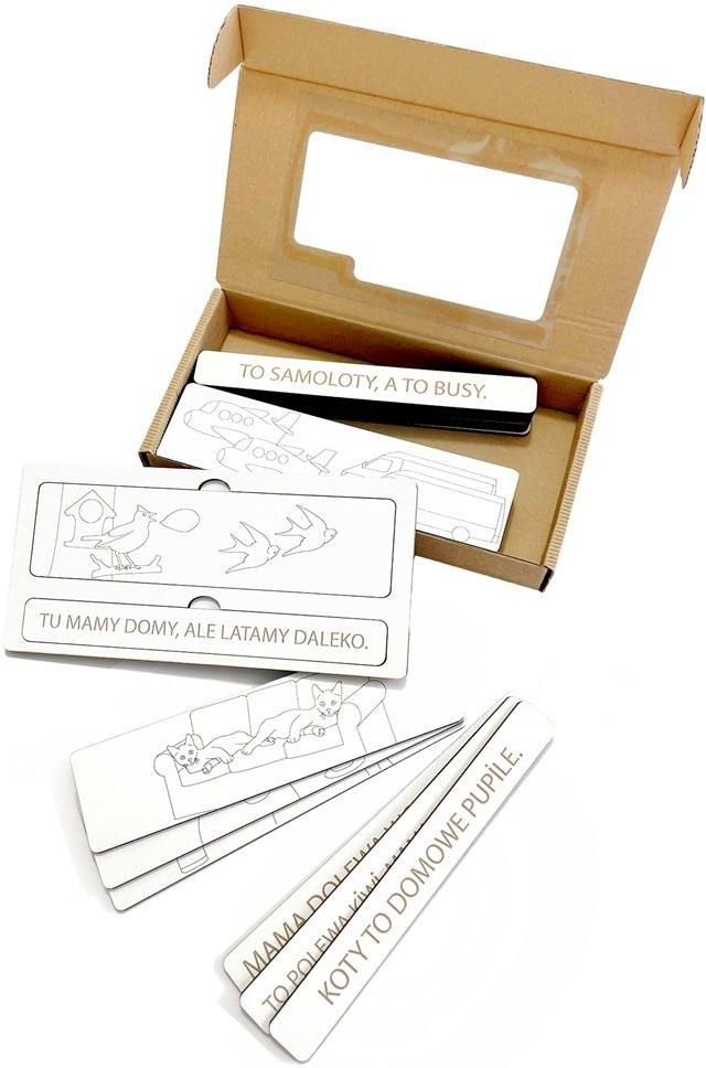 NAUKA CZYTANIA ZE ZROZUMIENIEM. Czy to jest w ogóle możliwe? Wymaga od dziecka koncentracji uwagi wzroki słuchowej. Kluczem do tego są ilustracje do zdań. Układanki ZDANIA Z SYLAB PRYMARNYCH I SEKUNDARNYCH są dostosowane do potrzeb dziecka i doskonale sprawdzają się w nauce czytania Metodą Sylabową. Układanki są dostępne, aż w 7 różnych częściach. Trudności zdań rosną wraz z każdą częścią (od najprostszych w części 1 do najtrudniejszych w części ostatniej). Ilość elementów: 25 z czego 12 płytek z obrazkami oraz 12 płytek ze zdaniami (utworzonymi z sylab prymarnych otwartych z wykorzystaniem paradygmatów P, M, L, B, F, W, T, D, S, K) oraz podstawą bazową, Klasa: 3+ Oprawa: pudełko Format: 222x116 mm