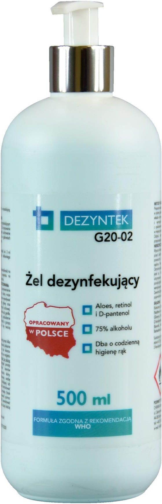 Dezyntek Żel dezynfekujący do rąk z aloesem 500ml Charakterystyka: Żel do higienicznej dezynfekcji rąk i stóp o działaniu wirusobójczym (w tym wobec koronawirusa), bakteriobójczym, grzybobójczym. Zawartość alkoholu etylowego 75% v/v, tj. 67,8 g/100 g preparatu oraz dodatek substancji wspomagających działanie biobójcze zapewnia bardzo dobre działanie dezynfekujące. Dodatkowo zawiera składniki działające ochronnie na skórę, zmniejszając efekt wysuszenia oraz podrażnień. Przeznaczenie: DEZYNTEK G20-02 jest przeznaczony do zastosowań powszechnych i profesjonalnych. Preparat przeznaczony do dezynfekcji rąk i stóp (kat. 1, gr. 1). Do stosowania w warunkach domowych oraz w miejscach, gdzie zachowanie najwyższych standardów higieny jest niezbędne, np. w gabinetach kosmetycznych, fryzjerskich, klubach fitness, basenach, itp. Sposób użycia: Tylko do użytku zewnętrznego. Żelu DEZYNTEK G20-02 nie należy rozcieńczać przed aplikacją, gdyż osłabi to działanie biobójcze preparatu. Dezynfekcja rąk: Naciskając dozownik rozprowadzić na czystą i suchą skórę dłoni ok. 3 ml preparatu i wcierać przez ok. 60 sekund do całkowitego wchłonięcia i wyschnięcia, nie spłukiwać. Czynność tę można powtórzyć w celu zapewnienia skuteczniejszego działania. Przeciwskazania: Nie stosować przy nadwrażliwości na jakiekolwiek składniki preparatu. Nie nanosić preparatu na uszkodzoną lub podrażnioną skórę. Produkt posiada rejestrację jako produkt biobójczy. Vat na produkt wynosi 8%. Produktów biobójczych należy używać z zachowaniem środków ostrożności. Przed każdym użyciem należy przeczytać etykietę i informacje dotyczące produktu.