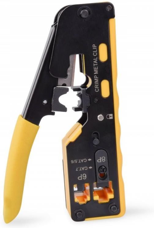 Zaciskarka RJ45 RJ12 RJ11 wtyki przelotowe Digitus DN-94025 (Kod PLU: __7504__) o niezastąpione narzędzie dla profesjonalistów i entuzjastów zajmujących się instalacjami sieciowymi. Zaprojektowane z myślą o łatwości użycia, trwałości i precyzji, zaciskarki są kompatybilne z wtykami przelotowymi kategorii 5e i 6, zarówno w wersji ekranowanej, jak i nieekranowanej. Dedykowana do złącz przelotowych Digitus: X-ML-5F-EZ, X-ML-5U-EZ, X-ML-6F-EZ, X-ML-6U-EZ. Podstawowe cechy: Narzędzie do zaciskania złączy przelotowych, Uniwersalność: Zaciskarki są kompatybilne z wtykami przelotowymi RJ45 (8P8C), kategorii 5e i 6, RJ12 (6P6C), RJ11 (6P4C), Precyzja: Zapewniają dokładne i mocne zaciskanie wtyków, co gwarantuje stabilne i niezawodne połączenia, minimalizując ryzyko błędów instalacyjnych, Łatwość Użycia: Ergonomiczna konstrukcja uchwytów oraz intuicyjny mechanizm zaciskania sprawiają, że narzędzie jest łatwe i wygodne w użyciu, nawet podczas długotrwałych prac instalacyjnych, Funkcjonalność: Narzędzie jest wyposażone w ściągacz izolacji oraz jednocześnie zaciska i obcina nadmiar przewodów, Trwałość: Wykonane z wysokiej jakości materiałów, zaciskarki są wytrzymałe i odporne na uszkodzenia, co zapewnia długotrwałe użytkowanie nawet w trudnych warunkach. Specyfikacja: Zakres zastosowania: do zaciskania wtyczek modułowych i koncentrycznych oraz do ściągania izolacji i przecinania kabli, Szybka i prosta obsługa, Terminacja wtyków przelotowych RJ45 (8P8C), kategorii 5e i 6, RJ12 (6P6C), RJ11 (6P4C), Ergonomiczny uchwyt, Trwała konstrukcja z metalu, Z funkcją obcinania kabli oraz ściągania izolacji. Kod PLU: __7504__