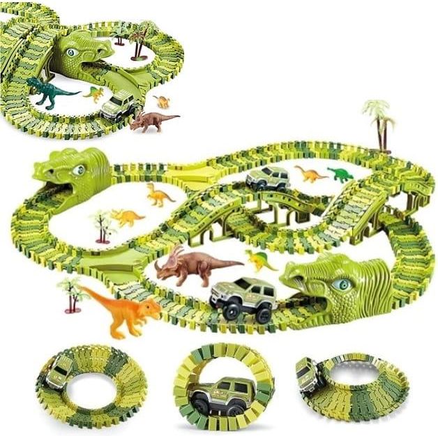 ELASTYCZNY OGROMNY TOR WYŚCIGOWY Park Dinozaurów W ZESTAWIE Z SAMOCHODEM WSPANIAŁA ZABAWA - ZBUDUJ SWÓJ WŁASNY DINO - TOR W zestawie 1 elektryczne autko - zasilanie: bateria 1xAA 1.5V (brak w zestawie) tor złożony z 240 segmentów umożliwia dowolną konfigurację 2 tunele w kształcie głów dinozaura 8 figurek dinozaurów 4 drzewa całkowita długość toru w linii prostej: 360cm zabawka przeznaczona dla dzieci powyżej 3 roku życia. ŁATWE ŁĄCZENIE I STABILNOŚĆ – fragmenty toru można w prosty i szybki sposób łączyć ze sobą, a dzięki spinkom konstrukcja zachowuje stabilność, ale również elastyczność podczas zabawy. ATRAKCYJNY WYGLĄD PARKU DINOZAURÓW – zestaw jest estetycznie wykonany, starannie wykończony oraz przypominający prehistoryczny świat dinozaurów, co wzbudza zainteresowanie i zachęca dzieci do zabawy. KREATYWNY – tor można dowolnie układać co wzbudza dziecięcą kreatywność. Możliwość różnych konfiguracji pozwala zrobić jeden tor lub kilka osobnych. Niezliczona ilość możliwości w budowie toru i aranżacji parku dinozaurów. Dziecko może ćwiczyć wyobraźnie i zdolności manualne podczas długiej i fascynującej zabawy. Łącząc elementy w zamknięte okręgi autko ma możliwość krążyć bez końca. BUDOWANIE ROZWIJA Zabawa torem może mieć bardzo dobry wpływ na rozwój intelektualny dziecka, świetnie rozwija jego zdolności motoryczne, pomaga w rozwinięciu koordynacji wzrokowo-ruchowej oraz orientacji przestrzennej. Budowanie toru pobudza jego wyobraźnię oraz doskonale rozwija zdolności manualne. Dziecko ma niezliczoną ilość możliwości budowy parku dinozaurów według swoich pomysłów!