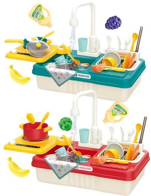 ZLEWOZMYWAK DUŻY ZLEW DLA DZIECI DO MYCIA NACZYŃ ZABAWKA KRAN XXL Jeśli Twoje dziecko interesuje się domowymi obowiązkami, nasz zestaw do zmywania to idealny sposób na połączenie zabawy z nauką. Wyposażony w dwukomorowy zlew, umożliwia zmywanie i suszenie naczyń w realistyczny sposób, a zdejmowany ociekacz dodaje autentyczności. Zestaw obejmuje zabawkowe owoce, warzywa, nóż, deskę do krojenia i talerze – idealne do kreatywnych zabaw w kuchnię. Zestaw ten rozwija umiejętności manualne i kreatywność, a strumień wody z kranu pozwala na naukę mycia naczyń i owoców w praktyczny sposób. Dzieci uczą się korzystania z podstawowych narzędzi kuchennych, takich jak nóż, widelec i łyżka, co wspiera rozwój ich samodzielności. Wymiary Opakowanie 42 x 27 x 12 cm Zlew 40x25x35 cm Wymagane baterie 3x 1,5v AA (brak w zestawie)
