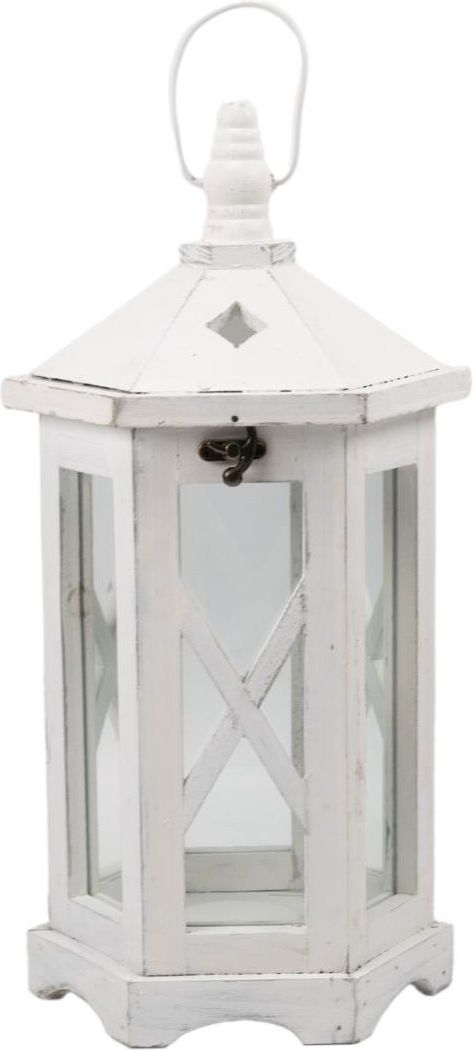 Dekoracyjny lampion ze szklanymi szybkami. Latarnia wykonana została z drewna koloru białego przecieranego w stylu retro. Dopełnienia i uroku dodają latarni szklane szybki o grubości 3 mm. Wysokość lampionu 38 cm. We wnętrzu drewnianej konstrukcji umiejscowiona została metalowa podkładka o średnicy 5,5 cm, na którą można postawić świecę. Lampion otwiera się od góry, poprzez górne wieczko, które zamykane jest metalowym haczykiem. Idealnie sprawdzi się on zarówno w pomieszczeniach, jak i na balkonach, tarasach czy ogrodach. Lampion posiada praktyczny uchwyt wykonany z metalu, dzięki któremu można go łatwo przenieść. Modny i klimatyczny lampion będzie ozdobą która umili Ci każdy wieczór. Wzór: biały rozmiar M Produkt 1 x lampion Wymiary wysokość 38 cm szerokość 20 cm długość 20 cm Materiał drewno metal szkło Użytkowanie ozdoba wnętrza