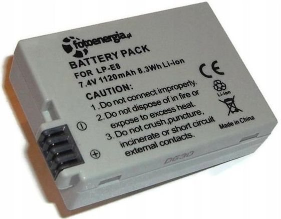 BATERIA DO CANON EOS 550D 600D 650D Kiss X4 Kiss X5 Zamiennik akumulatora: CANON LP-E8 Specyfikacja: Napięcie: 7,4 V Pojemność: 1120 mAh / 8,3 Wh Typ: Li-Ion Wymiary: 53.1 x 36.2 x 14.8 mm Producent: Fotoenergia Kod produktu: 4468 Pasuje do aparatów i kamer firmy Canon EOS 600D, 550D, EOS Kiss X4, EOS Rebel T2i Zalety akumulatora: Zgodność z oryginałem - można go ładować w oryginalnej ładowarce Nie posiada efektu pamięci - pozwala to na doładowywanie akumulatorka w dowolnym momencie, bez konieczności rozładowywania go Wyprodukowane z najwyższej jakości ogniw Li-ion - znacznie zwiększających żywotność Zabezpieczenia przed przeładowaniem i przegrzaniem Produkt nowy, w oryginalnym opakowaniu W zestawie Akumulator oryginalnie zapakowany w pudełko.