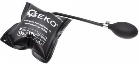 Poduszka montażowa pompowana do 135 kg. firmy Geko numer katalogowy G02627 Opis produktu Poduszka pompowana do unoszenia elementów o wadze do 135 kg. Wykonana z tkaniny na bazie wzmocnionego syntetycznego włókna.Wymiary 150 x 160 mm . Wężyk z pompką i zaworem bezpieczeństwa długości ok. 290 mm. Wysokość unoszenia ok 50 mm . Grubość nienapompowanej poduszki wynosi ok 2 mm . Przeznaczenie / zastosowanie Do unoszenia ciężkich elementów przy ich poziomowaniu np.przy osadzaniu okien lub drzwi , poziomowaniu mebli , lodówek lub pralek. Poduszki używane są również w warsztatach do awaryjnego otwierania drzwi samochodowych. Sposób użycia Wsunąć pustą poduszkę w szczelinę pod unoszonym przedmiotem , zakręcić zawór i naciskając rytmicznie pompkę napełniać stopniowo poduszkę unosząc przedmiot do góry. Przy opuszczaniu należy odkręcić zawór wypuszczając stopniowo powietrze. Parametry Maksymalna wysokość [mm]: 50 Wymiary podstawy [mm]: 150 x 160 Wysokość min [mm]: 2 Udźwig [kg]: 135