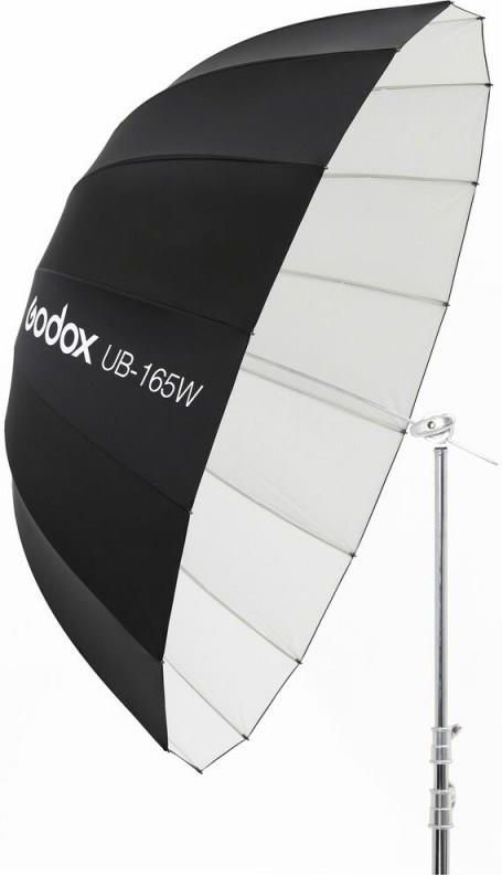 Parasolka paraboliczna biała równomiernie rozprowadza i rozprasza światło z dowolnego źródła: lamp błyskowych, żarówek czy też świetlówek fotograficznych. Jest podstawowym elementem wyposażenia studia w zakresie modyfikacji oświetlenia.     Zestaw zawiera: - parasolka Godox UB-165W - oryginalne opakowanie.