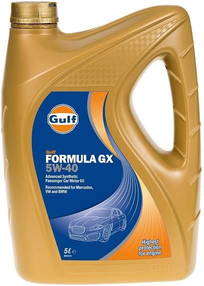 Gulf Formula GX 5W-40 SYNTETYCZNY OLEJ DO SILNIKÓW SAMOCHODÓW OSOBOWYCH Gulf Formula GX 5W-40 to zaawansowany w pełni syntetyczny (Syntetyk) olej silnikowy dla samochodów osobowych o wysokich parametrach, opracowany z myślą o najnowszej generacji samochodów osobowych, aut dostawczych i VAN-ów. Najnowsza technologia komponowania składu zastosowana w Gulf Formula GX 5W-40 zapewnia niezrównane poziomy ogólnego smarowania dla wszystkich typów pojazdów, szczególnie zaś samochodów osobowych, SUV, lekkich ciężarówek i VAN-ów, z silnikami o dużej mocy, doładowanymi i turbodoładowanymi, wielozaworowymi z wtryskiem paliwa. Produkt jest przewidziany szczególnie dla zapewnienia maksymalnej ochrony w ciągu wydłużonego okresu pomiędzy wymianami oleju. Olej przekracza w rzeczywistości wymagania wszystkich głównych światowych producentów OEM oraz norm przemysłowych. Zalety i korzyści Posiada nadzwyczajną stabilność termiczną i oksydacyjną, która obniża nawarstwianie się osadów i narostów. Wydłuża okresy pomiędzy kolejnymi wymianami oleju, zwiększa trwałość silnika a nadzwyczajna technologia zabezpieczenia przed zużywaniem się zapewnia wyjątkową ochronę w tym zakresie we wszystkich warunkach. Doskonałe charakterystyki w zakresie niskiej lotności obniżają zużycie oleju oraz zanieczyszczenie węglowodorami, natomiast aktywne środki czyszczące zapewniają maksymalną czystość silnika. Zwiększone własności tarciowe przynoszą w rezultacie oszczędność paliwa a nadzwyczajne własności niskotemperaturowe ułatwiają rozruch zimnego silnika w niskich temperaturach i zapewniają ochronę przez zużywaniem. Zastosowanie Olej Gulf Formula GX 5W-40 jest zalecany dla wszystkich najnowszych silników o wysokich osiągach, benzynowych i Diesla w samochodach osobowych, SUV, autach dostawczych i VAN-ach, szczególnie tych wykorzystujących najnowsze technologie, silników wielozaworowych, z turbosprężarką oraz o dużej pojemności cylindrów) oraz nowych silników Diesla z bezpośrednim wtryskiem z lub bez technologii common rail. W szczególności nadają się one do aplikacji miejskich związanych z częstym zatrzymywaniem się i uruchamianiem, dużym obciążeniem i/lub wysoką prędkością, tam gdzie konwencjonalne oleje zawodzą oraz tam gdzie oleje o takiej jakości są zalecane. Olej ten jest zalecany dla aplikacji z wydłużonym okresem pomiędzy wymianami. Aprobaty API SN, MB-Approval 229.5, VW 502 00, 505 00 Normy ACEA A3/B4, BMW Longlife-01, Porsche A40, Renault RN0700, Renault RN0710