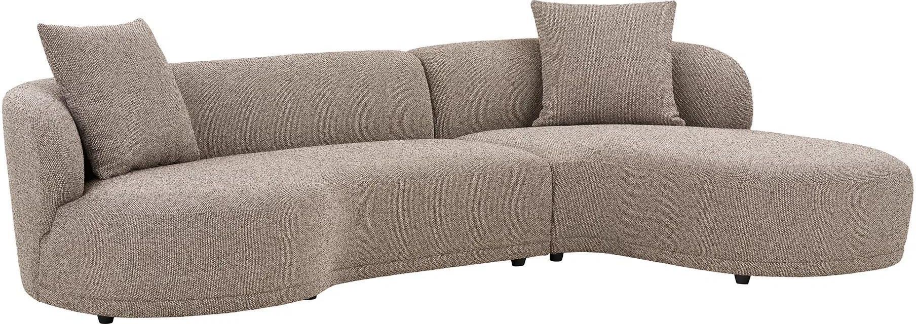 NAROŻNIK KINGSTON BOUCLE BRĄZOWY I Kingston to ekskluzywny narożnik o nowoczesnym, półokrągłym kształcie, stworzony z myślą o najbardziej wymagających użytkownikach, którzy cenią wysoką jakość wykonania, komfort oraz wyrafinowaną estetykę. Tapicerowany modną tkaniną bouclé w odcieniu brązowym, nie tylko zachwyca wyjątkowym wyglądem, ale również wprowadza do wnętrza przytulność, ciepło i elegancję. Dodatkowym atutem mebla jest stylowy wygląd oraz zaokrąglone kształty, które od razu podkreślają wyjątkowy charakter. Wysoki komfort codziennego użytkowania zapewniają szerokie siedziska oraz miękkie oparcie, wypełnione wysokiej jakości pianką, gwarantującą optymalne podparcie oraz niesamowitą wygodę podczas jej użytkowania. Kingston został osadzony na stabilnej podstawie z prostymi, czarnymi nogami o eleganckim designie, co dodatkowo wzmacnia jego nowoczesny charakter. To idealna propozycja dla osób poszukujących mebla, który harmonijnie łączy funkcjonalność, wyjątkowy styl i luksusowy komfort. Kingston bez trudu wzbogaci zarówno klasyczne, jak i nowoczesne wnętrza, nadając im stylu, wyrazistości, charakteru oraz elegancji. W serii KINGSTON występują również narożniki w różnych konfiguracjach oraz kolorach - patrz produkty powiązane. Narożnik kingston, prawostronny, brązowy, tkanina bouclé z dwoma poduszkami oraz czarnymi nogami HN1299