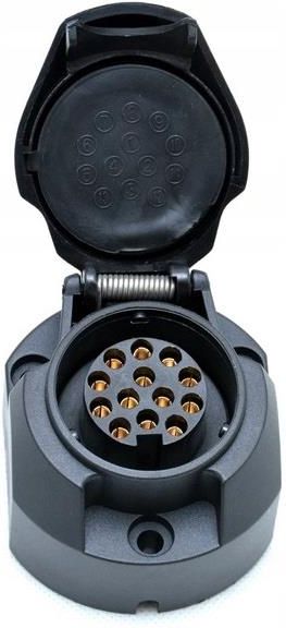 GNIAZDO 13 PIN / bolcowe - uniwersalne 12/24V do zastosowania w samochodach osobowych, dostawczych, zabudowach itp. materiał: tworzywa sztuczne pasuje do wszystkich wiązek elektrycznych haka holowniczego z gniazdem 13 biegunowym styki wykonane z mosiądzu z przecięciami krzyżowymi