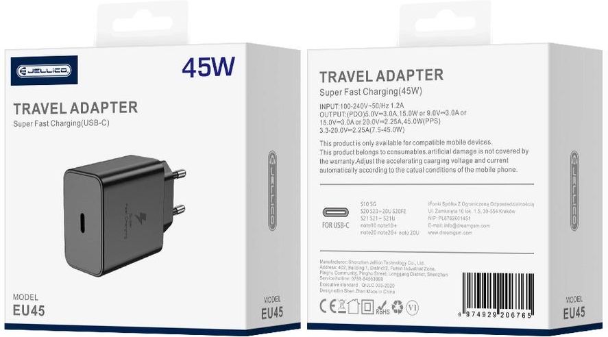 Ładowarka sieciowa USB-C PD 45W EU45 Ładowarka sieciowa Jellico EU45 umożliwia niezwykle szybkie i bezpieczne ładowanie urządzeń mobilnych. Wyposażona w gniazdo USB-C, które obsługuje technologię szybkiego ładowania Super Fast Charging pozwala na znacznie szybsze niż standardowe naładowanie telefonu. Zaawansowany system zarządzania energią zapewnia optymalny prąd ładowania. Ładowarka posiada wielostopniowy system ochrony zapewniający stabilną i bezpieczną pracę, jednocześnie eliminując ryzyko uszkodzenia ładowanego urządzenia. Główne cechy Umożliwia ładowanie smartfonów oraz tabletów (włącznie z nowymi modelami) Niewielkie rozmiary oraz szeroki zakres napięć pozwolą zabrać ładowarkę w każdą podróż (doskonale mieści się w torebce, torbie na laptopa czy plecaku) Wbudowana technologia szybkiego ładowania 45W (Super Fast Charging) Ładowarka automatycznie dobierze moc do ładowanego urządzenia - bezpieczna dla baterii Twojego telefonu! Zapakowana w eleganckie pudełko producenta - idealna na prezent! Specyfikacja Napięcie wejściowe: AC 100 - 240 V / 50 - 60Hz Napięcie wyjściowe: PDO 5.0 V - 3A / 9.0 V - 3A/ 15.0 V - 3A/ 20.0 V - 2.25A Napięcie wyjściowe: PPS 3.3-20 V / 2.25A Moc wyjściowa: 45W Funkcja szybkiego ładowania PD 3.0 20V Automatyczne dostosowywanie prędkości ładowania do urządzenia Kolor: Czarny Waga: 40 g Ładowarka sieciowa została wykonana z twardego poliwęglanu, który dzięki błyszczącej powłoce jest łatwy w czyszczeniu. Ładowarka zachowuje stylowy oraz elegancki design przez długi czas. Urządzenie posiada niewielkie wymiary, dzięki czemu bez problemu zmieści się w każdym plecaku czy torbie. LAD0JEU45