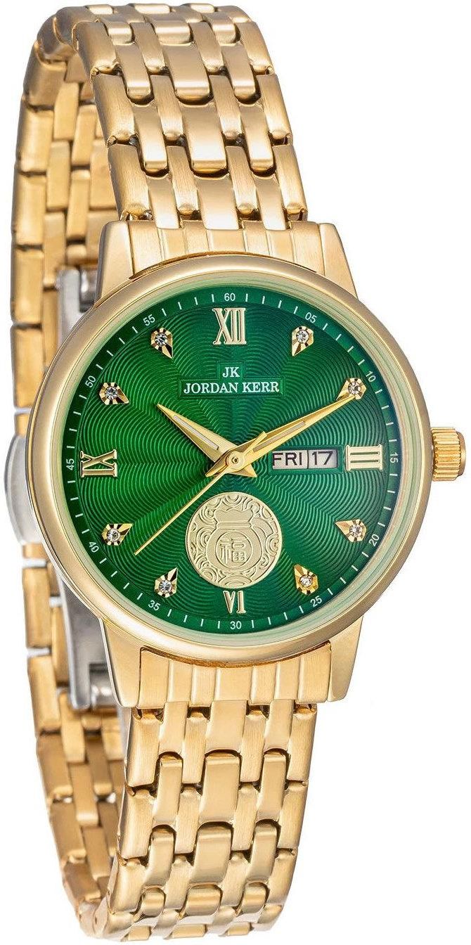 Zegarek damski Jordan Kerr L1071 Już dziś wybierz swój nowy, elegancki, funkcjonalny, a co najważniejsze klasyczny zegarek, który sprawdzi się bez względu na okazję. Zegarek ten wyposażony został w niezawodny mechanizm kwarcowy, zapewniający wieloletnią żywotność oraz precyzyjne odmierzanie czasu. Nowoczesna tarcza z datownikiem zapewnia przejrzysty i czytelny wygląd. Koperta zegarka połączona została z metalową bransoletą. Wodoszczelność 30M oznacza, że zegarek jest odporny na zachlapania. Czasomierze te wyprodukowane są z bezpiecznych materiałów, które nie tylko nadają się dla osób z wrażliwą skórą, ale i również dla alergików. Zegarek sprawdzi się jako prezent, który zachwyci swoim wyglądem, funkcjonalnością oraz będzie stanowił wartościową pamiątkę. Nasza firma oferuje również dodatkowo płatną usługę grawerowania, dzięki której możemy podarować bliskiej nam osobie pamiątkę w formie dedykacji na zegarku, co stanowi niepowtarzalny i wyjątkowy upominek. Idealny na prezent dla kobiet ceniących sobie styl i elegancję. Mechanizm: W zegarku osadzony został mechanizm kwarcowy. Pasek/bransoleta: Metalowa bransoleta. Koperta: Metalowa. Szkiełko: Mineralne. Wodoszczelność: Wodoszczelność 30M oznacza że zegarek jest odporny na zachlapania. Kolorystyka: Tarcza: kolor zielony, Wskazówki: kolor złoty. Koperta: kolor złoty, Bransoleta: kolor złoty. Funkcje: Datownik - wskazuje aktualny dzień tygodnia oraz miesiąca. Wymiary: koperta: szer. 30 mm, gr. 10 mm, wys. 30 mm, szerokość mocowania: 14 mm, szerokość bransolety: 14 mm, obwód max: ok 17 cm Co jest w zestawie? Oryginalny zegarek Jordan Kerr Dowód zakupu/rachunek Kartę gwarancyjną podbitą pieczątką