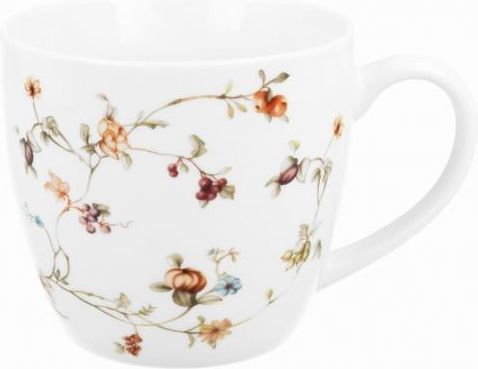 Duży kubek Safa wchodzący w skład kolekcji Romantic. Pojemność całkowita kubka 490 ml (pojemność liczona po rant kubka). Wykonany jest z porcelany New Bone, charakteryzującej się elegancką i naturalną kremowo - białą barwą z delikatnym połyskiem a także wyjątkową wytrzymałością przy zachowaniu lekkości i delikatności. Doskonały do przyrządzania ulubionej kawy i aromatycznej herbaty. Linia zdobiona motywem drobniutkich kwiatuszków i owoców w pastelowych kolorach. Całość zapakowana w oryginalne opakowanie z uchwytem z tym samym motywem to doskonały pomysł na niebanalny prezent urodzinowy zarówno dla kobiety i mężczyzny, a także podarunek dla szefa czy nauczyciela, również jako podziękowanie. Wzór: Safa Produkt 1 x kubek 1 x obwoluta Wymiary Średnica: 10,2 cm Wysokość: 9,5 cm Pojemność całkowita: 490 ml Pojemność użytkowa około 460 ml Materiał porcelana Użytkowanie dopuszczone do kontaktu z żywnością zmywarka mikrofala