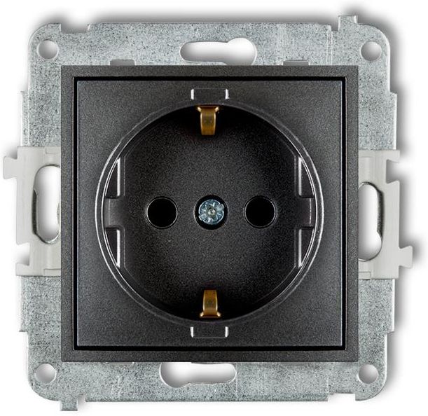 Gniazdo pojedyncze Schuko z przesłonami w kolorze grafitowym z serii ICON, marki Karlik. Gniazdo elektryczne z uziemieniem Schuko charakteryzuje się innym umiejscowieniem uziemienia (dwa bolce z boku) wyposażone w przesłony torów prądowych. Przeznaczone jest na rynek w innych krajach (m.in. do Niemiec). Do kompletu wymagana ramka. Można stosować do systemów ramkowych wielokrotnych. Przesłony torów prądowych to zaślepki, które uniemożliwiają włożenie do gniazdka innych przedmiotów niż wtyczka. Takie rozwiązanie jest szczególnie przydatne gdy chcemy uniemożliwić dostęp do gniazdka np. dzieciom. Podtynkowa seria ICON to nie tylko wysokiej jakości mechanizmy gniazd i łączników. Funkcję dekoracyjną tej linii produktów pełnią przede wszystkim ramki, wśród których mamy do wyboru trzy różne kształty: kwadratowy, okrągły i zaokrąglony.