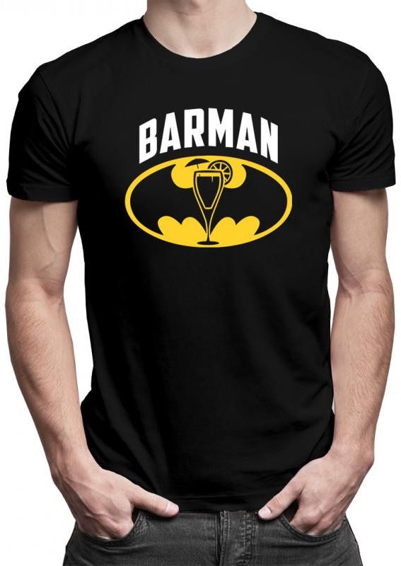 Śmieszna koszulka dla barmana – superbohatera Chyba każdy kojarzy logo Batmana, które możemy spotkać na wielu gadżetach. Koszulka dla barmana została stworzona w taki sposób, aby umieszczona grafika nawiązywała do logo tego superbohatera. Barman też w swojej pracy musi czasami przeobrazić się w superbohatera, dlatego taki t-shirt to idealny prezent dla barmana. Logo zostało przerobione w taki sposób, że w środku widnieje kieliszek z drinkiem. Taka zabawna koszulka dla barmana na pewno rozśmieszy nie tylko jego, ale także klientów.