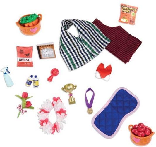 ZESTAW AKCESORIÓW PIELĘGNACJA KONIA – CHAMPIONAdo kreatywnej zabawy laleczkami o wielkości 15cm W skład zestawu wchodzą m.in.: puchar medal wstążka do dekoracji girlanda dla konia bukiet kwiatów szampon i odżywka do pielęgnacji konia opakowanie karmy dla konia koszyk pełen marchewek koszyk pełen jabłek buteleczka – spray książeczka konia podkładka pod siodło 2 koce/derki dla konia nakładka na uszy konia Zestaw nie zawiera lalki widocznej na zdjęciu. Zabawka wolna od FTALANÓW i BPA (Bisfenolu A).Przeznaczona dla dzieci w wieku od lat 3. Całość w ładnym, otwartym opakowaniu o wymiarach 16,8cm x 22,3cm x 4,5cm z atrakcyjną grafiką. IDEALNE NA PREZENT.Opakowanie, przez wzgląd na środowisko, wykonane jest z wykorzystaniem materiałów pozyskanych z recyklingu i w sposób nadający się do dalszego przetworzenia. W ramach serii dostępny jest drewniany loft dla laleczek o wielkości 15cm oraz liczne zestawy mebli do atrakcyjnego urządzenia poszczególnych części domu. Szalenie pomysłowe i liczne akcesoria stymulują do kreatywnej zabawy – wymyślania scenek i narracji – POLECAMY! Lori – marka kanadyjskiego producenta lalek OurGeneration. Kolekcja małych uroczych 15-centymetrowych laleczek, które pasują wszędzie. Idealne, by mieć je zawsze przy sobie, a nawet zabrać w podróż. Mają miękki tułów, ruchome kończyny i ruchomą głowę oraz piękne, łatwe do czesania włosy. Szykowne, rezolutne, o bystrym, a równocześnie uprzejmym spojrzeniu – przy tym pełne wdzięku i otwarte na nowe wyzwania. Dzięki swojej wyobraźni, zdolnościom i pozytywnemu podejściu do życia, nigdy się nie nudzą. Z radością oddają się ćwiczeniom baletowym, doskonaląc swoje umiejętności. Z troską dbają o ukochane zwierzęta. Z przyjemnością spędzają czas w towarzystwie przyjaciółek, goszcząc je często w swoim nowoczesnym i wygodnym domu. Są również, a jakże, aktywne zawodowo. Uwielbiają także podróże – te dalekie i te za miasto, w wolny weekend. Wysmakowane stylizacje zarówno samych laleczek, jak i licznych zestawów do kreatywnej zabawy z serii Lori, przypadną do gustu zarówno dziewczynkom, jak i ich mamusiom. Różnorodność modeli przyprawi Was o zawrót głowy! Przygotujcie się na niezapomniane przygody z super szykownymi laleczkami Lori oraz ich uroczymi pupilami i wyjątkowymi akcesoriami do kreatywnej zabawy! Ważne: laleczki, ubranka i akcesoria wykonane są z nietoksycznych materiałów – nie zawierają ftalanów ani BPA (Bisfenolu A). Marka Lori ma również ambicje być synonimem dbałości o środowisko – opakowania wykonane są z wykorzystaniem materiałów pozyskanych z recyklingu i w sposób nadający się do dalszego przetworzenia. Idealny pomysł na prezent dla dziewczynek w wieku 5-10 lat.