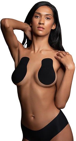 Materiałowe plastry liftingujące biust i osłaniające sutki - Bye Bra Matt Fabric Pull-ups XL Propozycja dla kobiet, które chcą zrezygnować ze stanika, np. z uwagi na wyjątkowo wyciętą z tyłu czy u góry kreację. W takich przypadkach obecność biustonosza rzuca się w oczy i zaburza całą kompozycję. Jeśli zaś zdecydujemy się na nakładki, to piersi otrzymują odpowiedni support, są podciągnięte, nabierają krągłości, a przy tym całość nie jest widoczna dla postronnych. Część przysłaniając miseczkę jest na tyle duża, że całkowicie okrywa sutki, co chroni je przed podrażnieniem, ale też sprawia, że nawet gdy nabrzmieją, to nie będą odznaczały się pod kreacją. Takie nakładki można z powodzeniem nosić zarówno do kreacji eleganckich i wymagających, jak i do strojów luźnych, casualowych, imprezowych. Cechy produktu: przebadane dermatologicznie hipoalergiczne podnosi i formuje biust z materiału, bezszwowe czarne Rozmiar XL