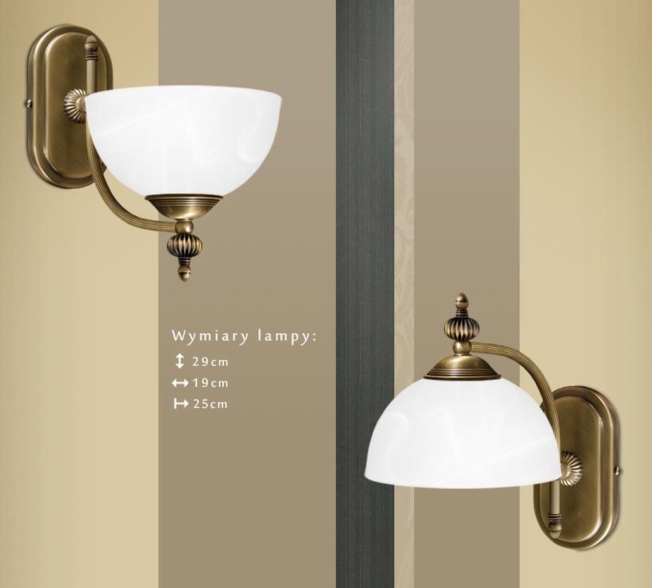 Kinkiet z mosiądzu. - Wykonany w całości z elementów z pełnego mosiądzu. Mosiądz to trwały, szlachetny i ponadczasowy materiał - kliknij, aby dowiedzieć się więcej. - Wykończenie mosiądzu: złota patyna. - Zawiera włoski ozdobny odlew mosiężny. - Uniwersalny montaż: kinkiet może być skierowany kloszem w górę lub w dół. - Klosz szklany do wyboru: biały ‘alabaster’ lub ecru ‘alabaster’ (albo na zamówienie ecru gładki w zależności od dostępności). - Wymiary całkowite: wysokość 29cm, głębokość 25cm, średnica klosza 19cm. - Możliwość zainstalowania włącznika łańcuszkowego (bez dopłaty), opis na dole strony:http://www.mninteriors.pl/lampy-na-zamowienie - Żródło światła: 1xE27 (żarówka tradycyjna/żarowa o mocy max. 60W) lub żarówka energooszczędna albo LED o większej mocy (np. odpowiednik 100W).Lampa jest fabrycznie nowa, wyprodukowana w Polsce. Gwarancja: 24 miesiące. Seria AK - zobacz wszystkie lampy