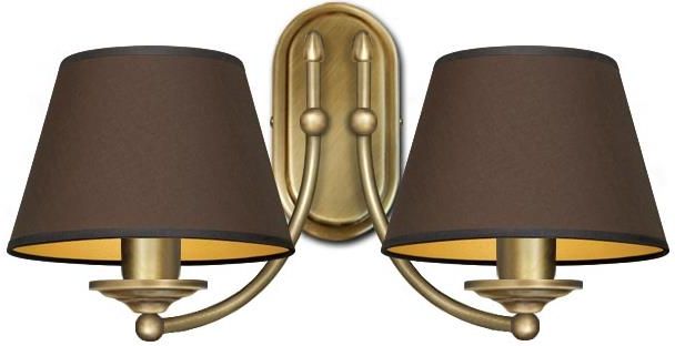 Klasyczny kinkiet mosiężny z dwoma abażurami. - Wykonany w całości z elementów z pełnego mosiądzu. Mosiądz to trwały, szlachetny i ponadczasowy materiał - kliknij, aby dowiedzieć się więcej. - Wykończenie mosiądzu: złota patyna.- Abażury ciemny brąz ze złotym środkiem lub ecru lub cappuccino …
